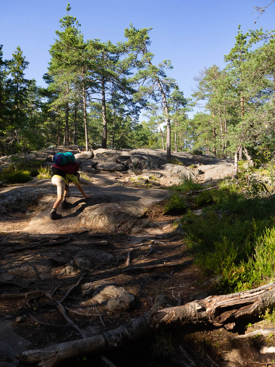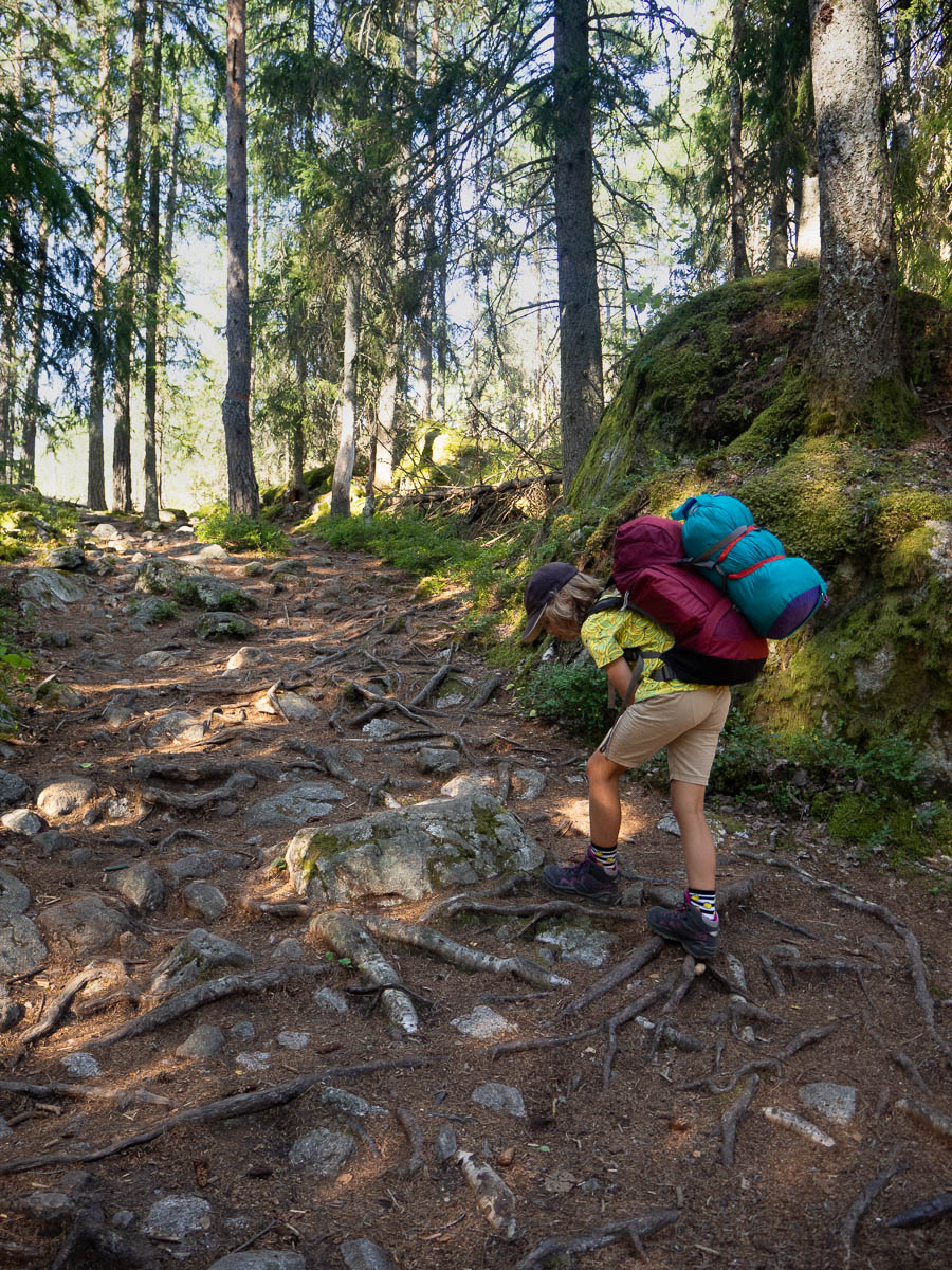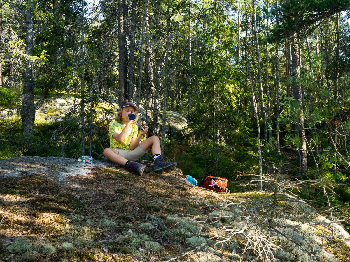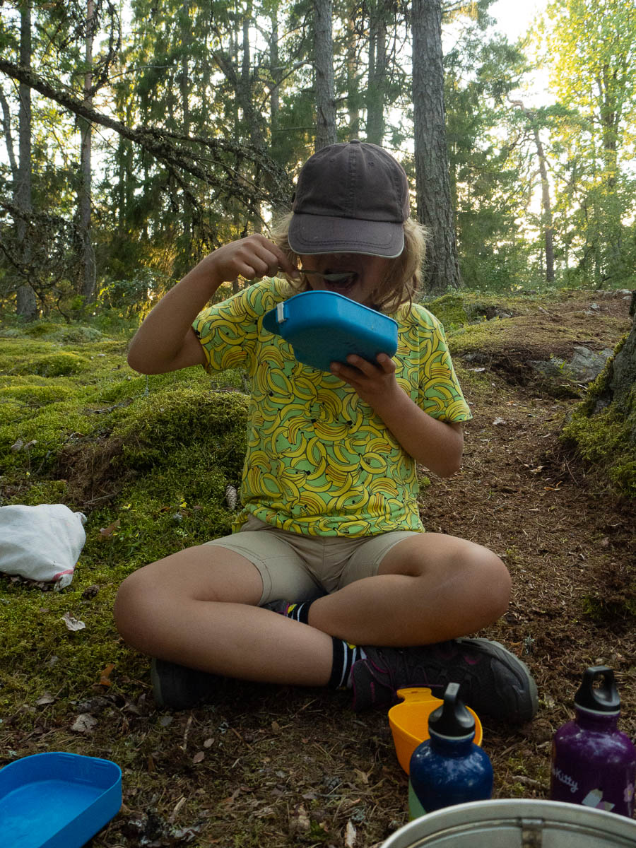 We aimed for the camping spot next to Årsjön in Tyresta. That’s about a 3 km hike from the parking lot. That’s nothing for Adrian, really, but today he really wasn’t in much of a walking mood and seemed to struggle with every single step. We took plenty of water and snack breaks on the way.