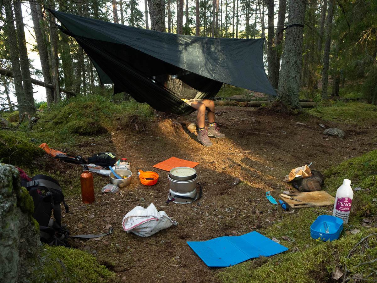 I myself had hoped to sleep in the shelter here at Årsjön, and the shelter was also my plan B for Adrian in case he didn’t like the hammock. (He did like it.) But with the amount of people here, the shelter was out of the question. I fell back to plan C which was simply sleeping on the ground. The nights are warm and cloudless right now, so the only potential problem was mosquitoes.