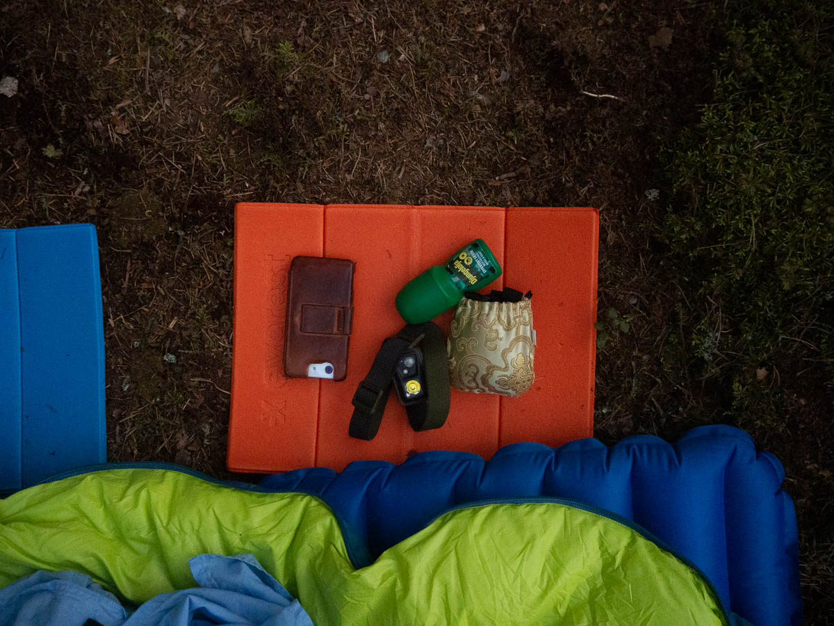 This was my “bedside table” for the night: phone, insect repellent, head torch, and a little bag with earplugs and a sleeping mask. I am a light sleeper and those last two are my lifesavers (sleepsavers?) when I sleep away from home.
