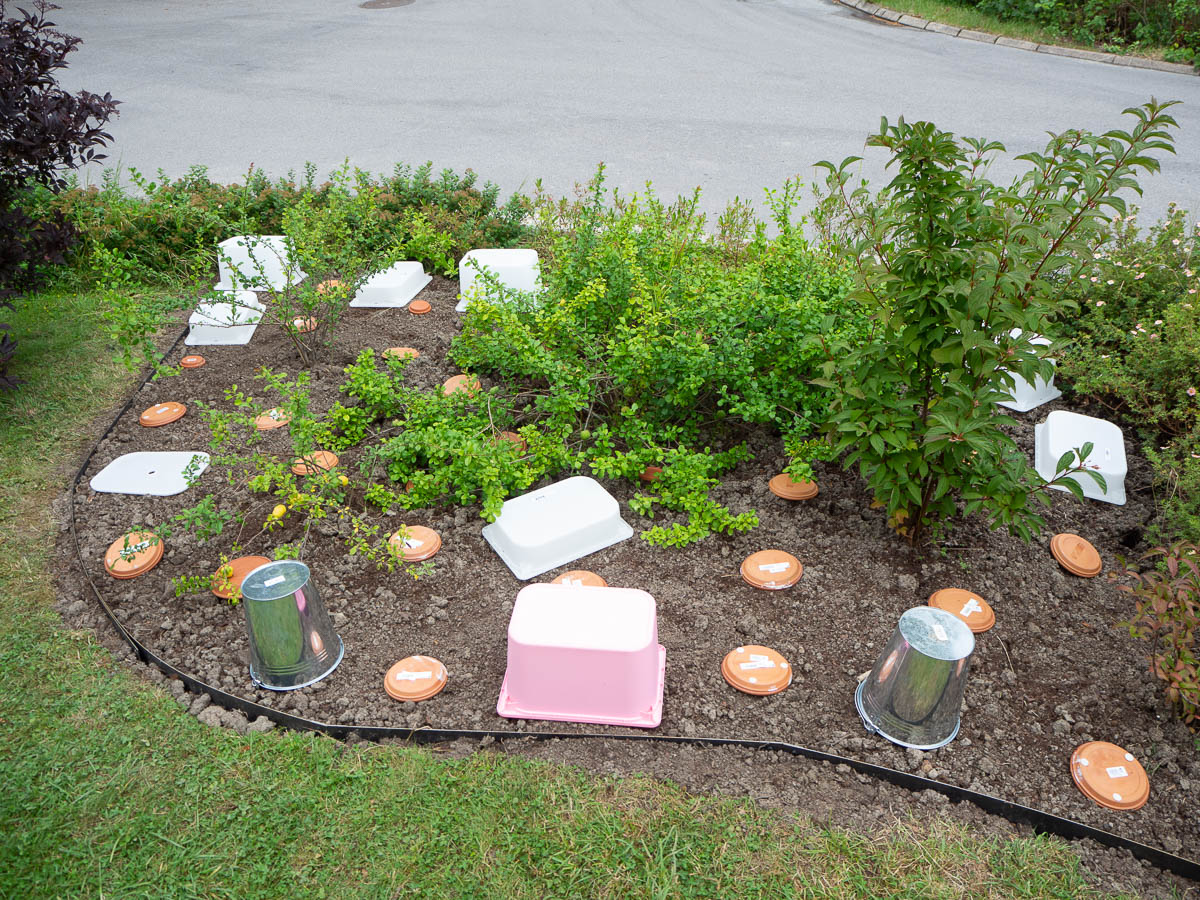 I’m playing with buckets and IKEA boxes again, to plan and design the new flowerbed. I first did this for the bushes and shrubs behind the house and this approach worked better than anything I’ve tried before. It gives a much better idea of the size of things.