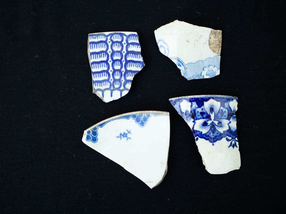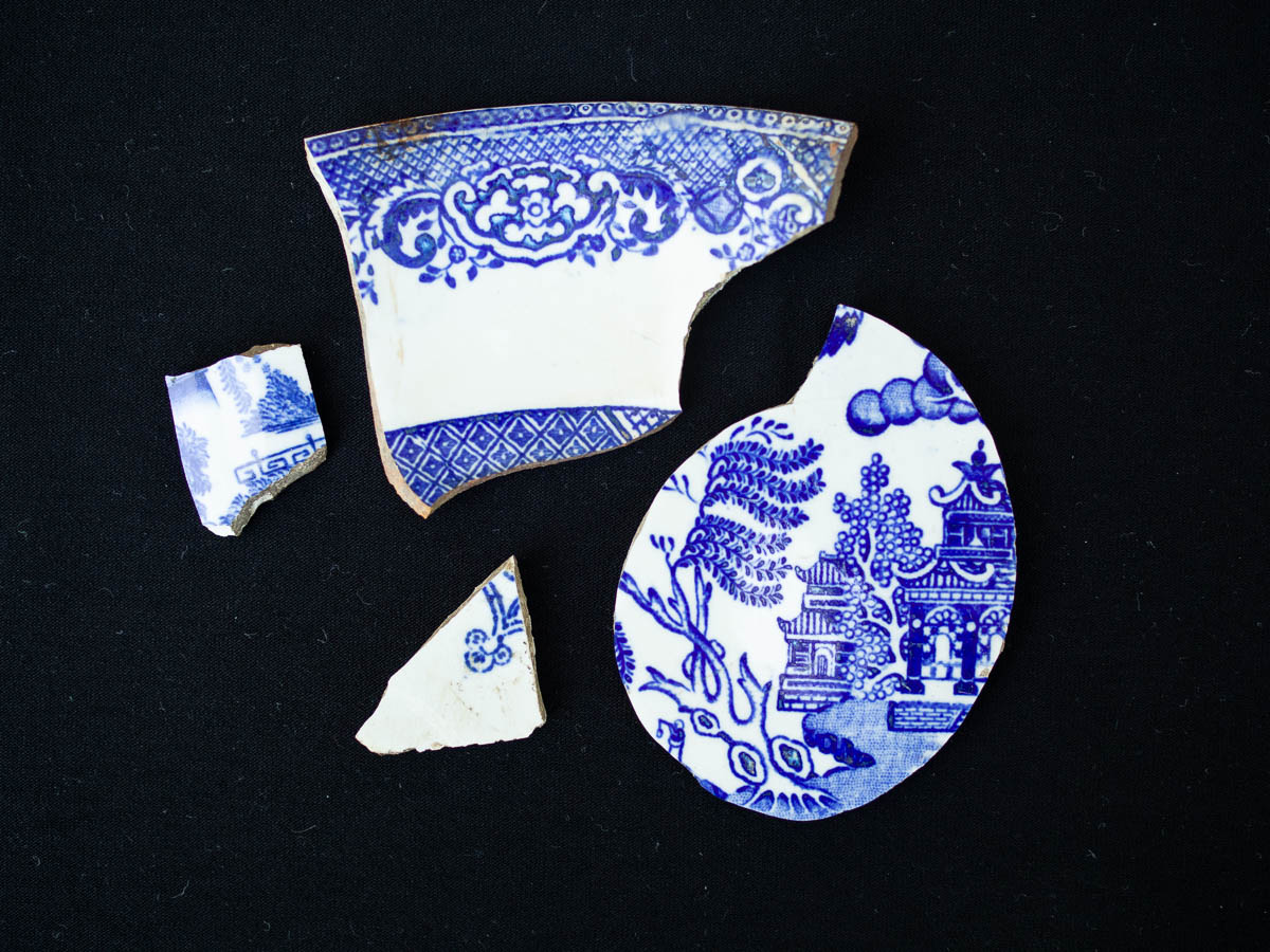 I found pieces of one or more plates with blue and white decorations in a Chinese style…