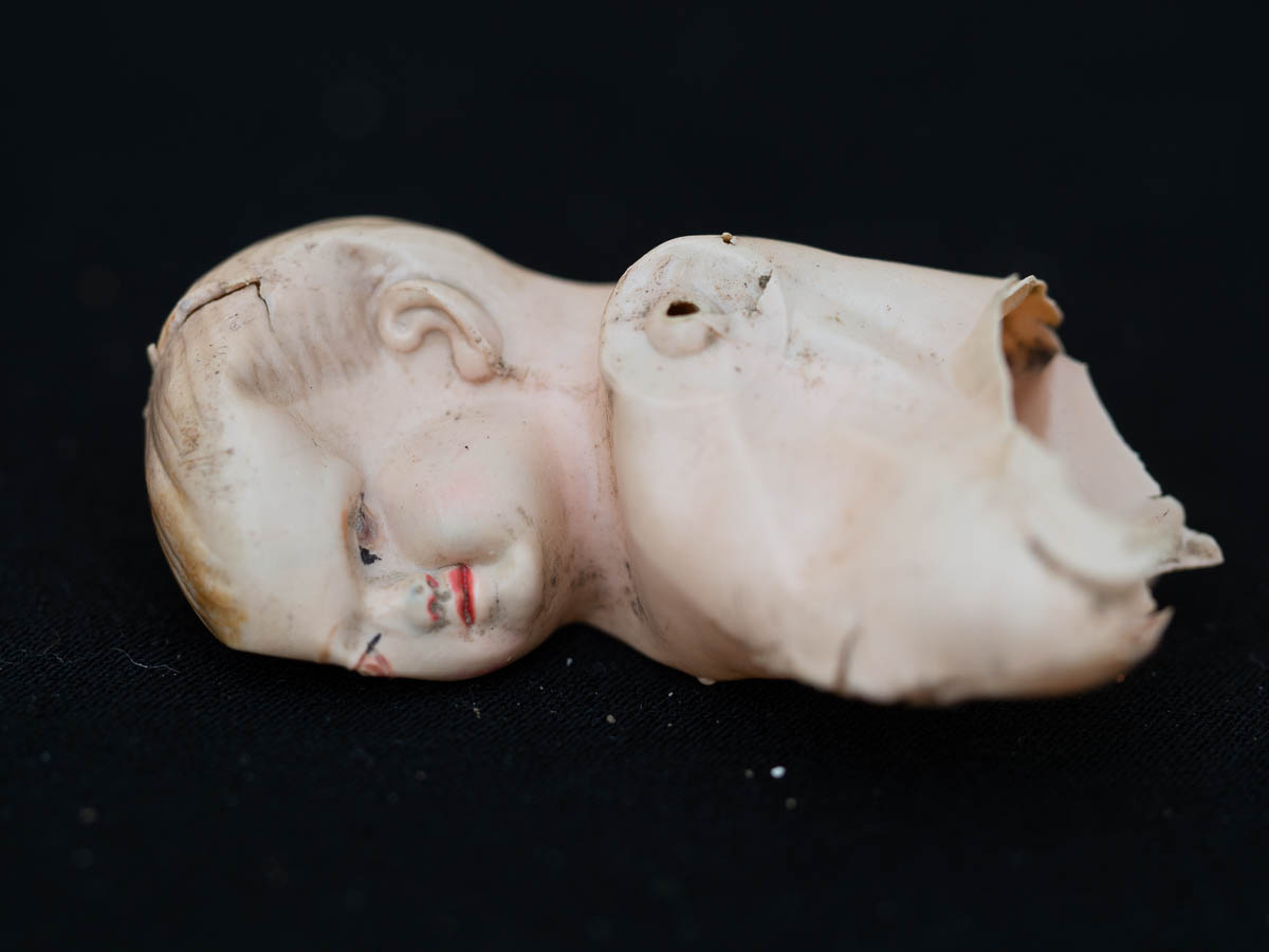 Also the head and torso of a small plastic doll, a little bit larger than a matchbox, slightly creepy.
