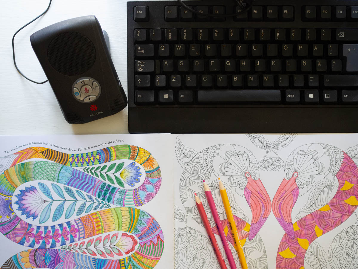 Giving myself something to do when I am passively listening helps a lot. A small distraction keeps worse distraction away. Crocheting works, and colouring. I keep my colouring books and pencils close at hand, in my desk drawer.