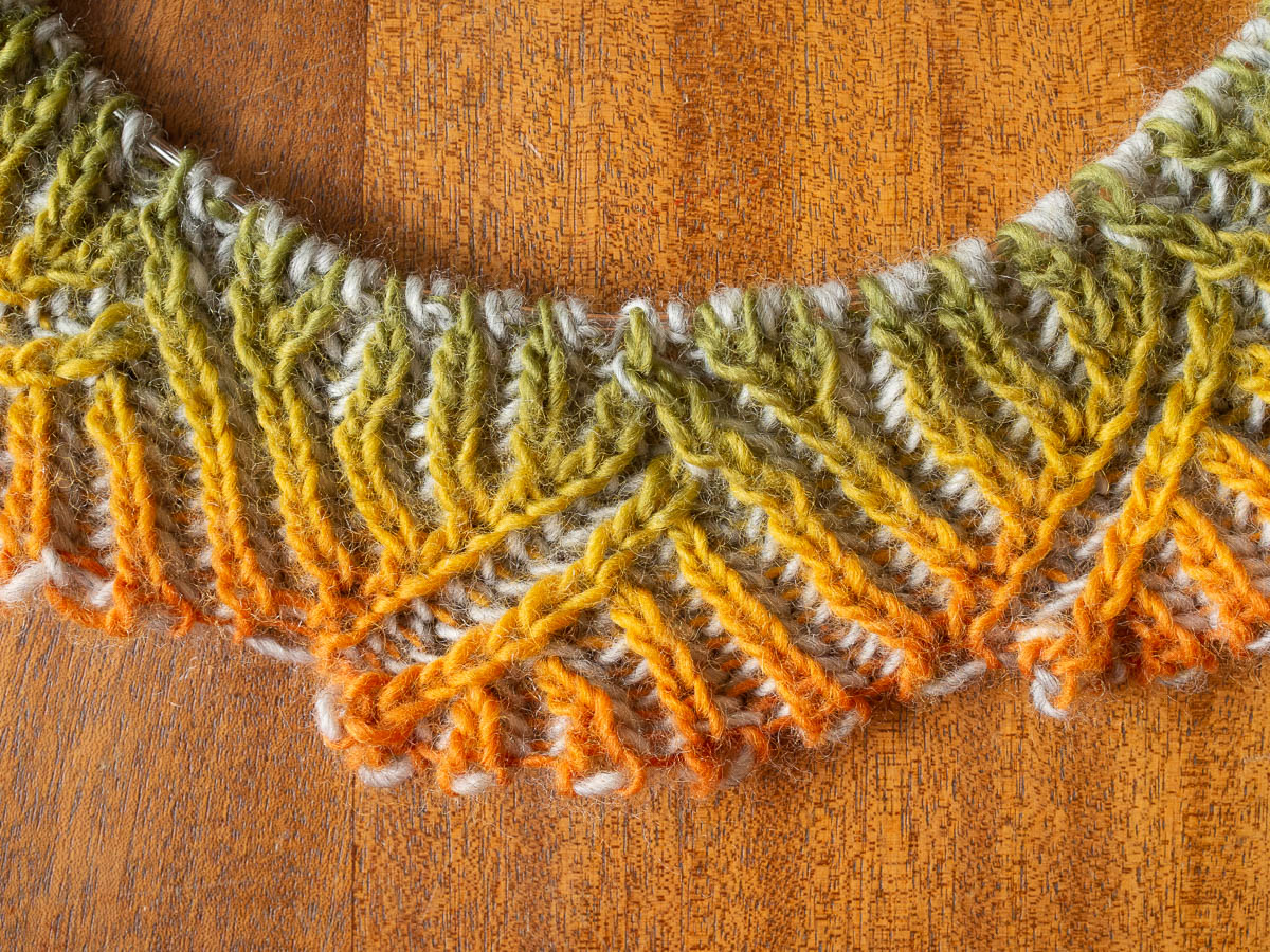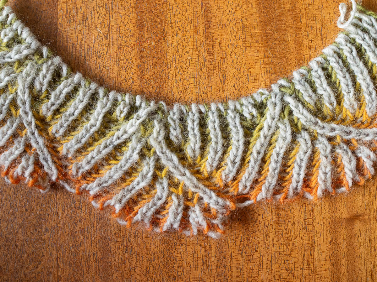 Still, I tried it out with some scrap yarn, and it turned out to be quite doable, as long as I paid close attention to what I was doing. As soon as I didn’t, I started making mistakes, and the only way to recover from a mistake in two-colour brioche is to rip up everything you did since the mistake, one stitch at a time.