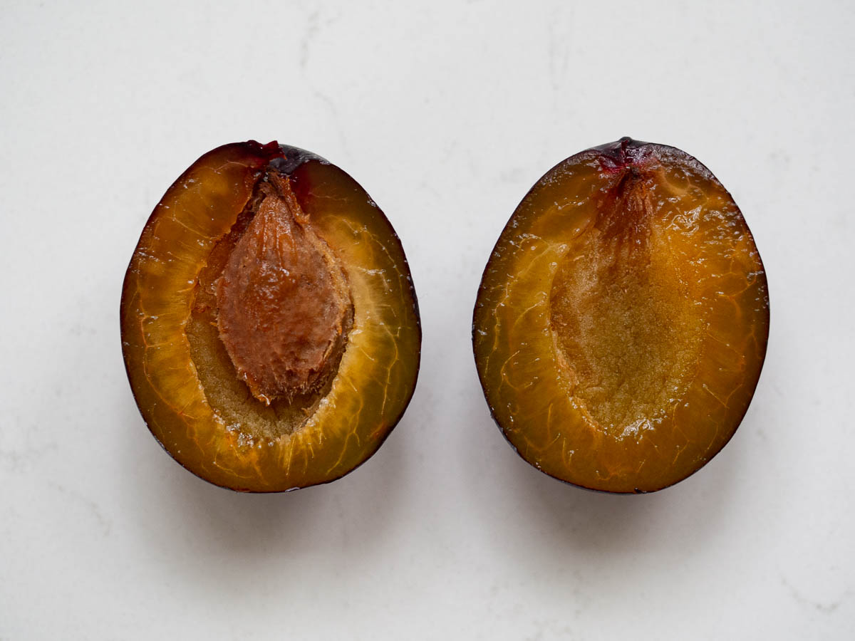 The inside of a plum looks almost like I imagine the inside of a body, with its fleshy surface threaded through with veins.