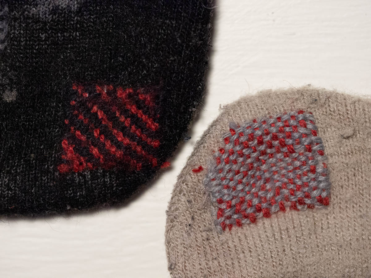 This fresh darning looks crisp and smart compared to the ones I did half a year ago. Almost too crisp, in fact: it doesn’t blend in. The older ones have become slightly felted by wear (even though the darning yarn is a wool mix rather than pure wool) and look a lot more cosy and natural.