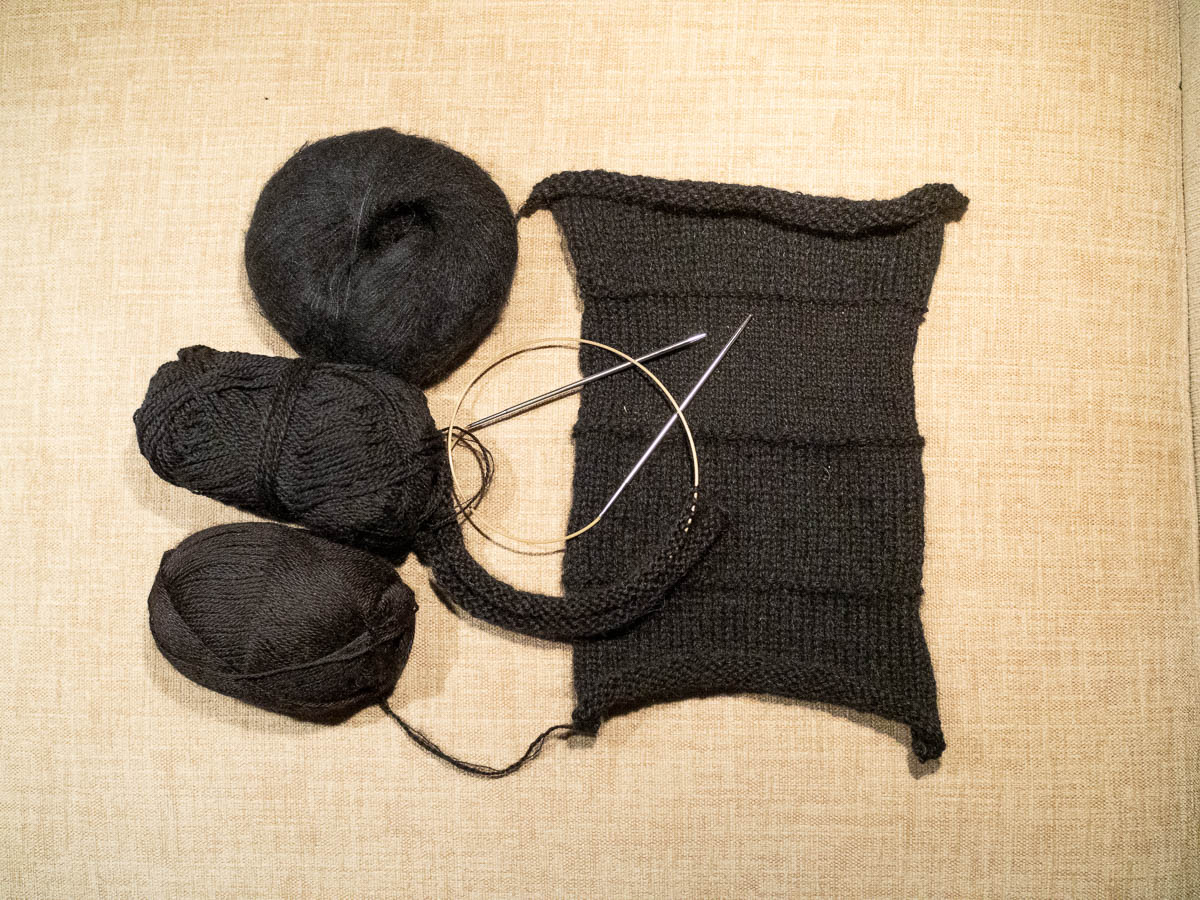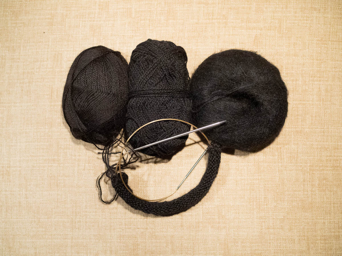 Among the black yarns I couldn’t find any that quite felt like what I had in mind. The merino wools were too smooth and bland; the plain Swedish and Norwegian wools too thick and not soft enough. I came home with a wool yarn and a mohair blend that, when combined, will hopefully work out. The wool will provide thickness and body and the mohair will soften it.