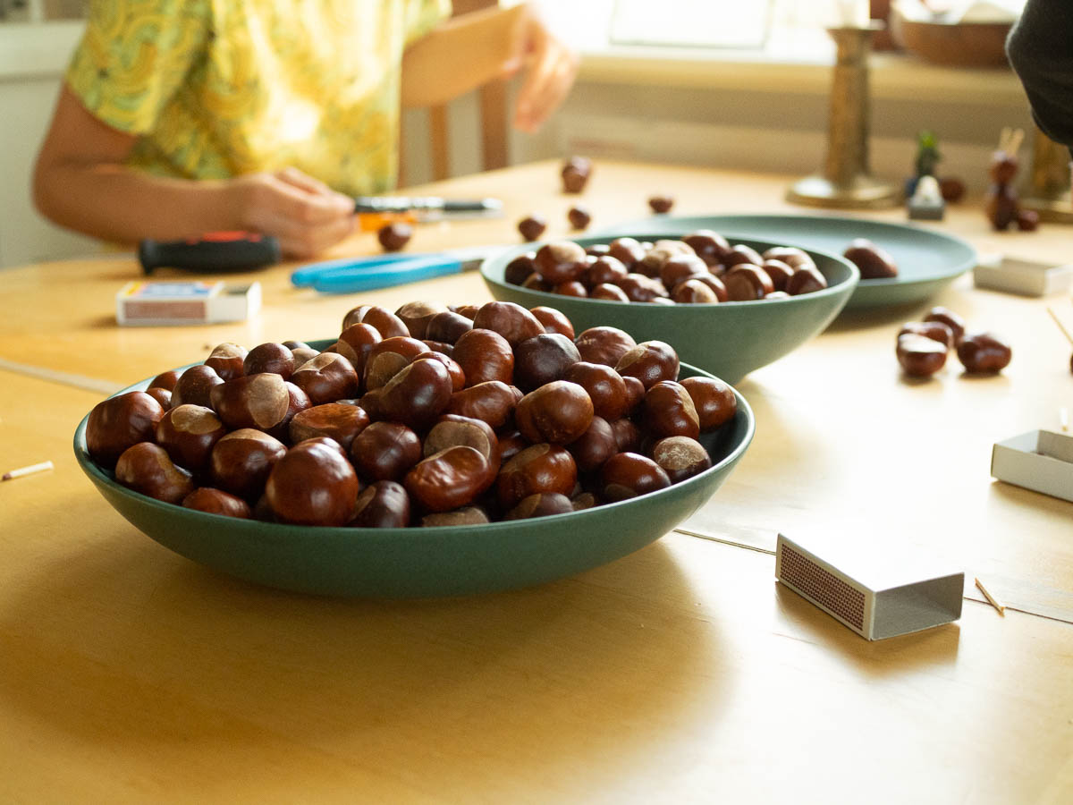 When we were poking around among the chestnuts in the bowl and commenting on the lack of choice, Adrian went off and came back with his school backpack, which contained at least another kilogram of chestnuts. Small, large, flattish or round – now we have lots of all sorts. They filled not just another bowl, but an entire large dish.