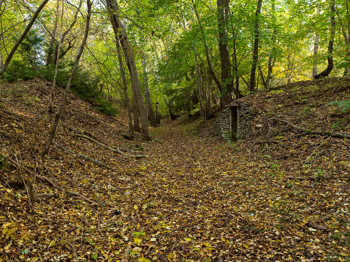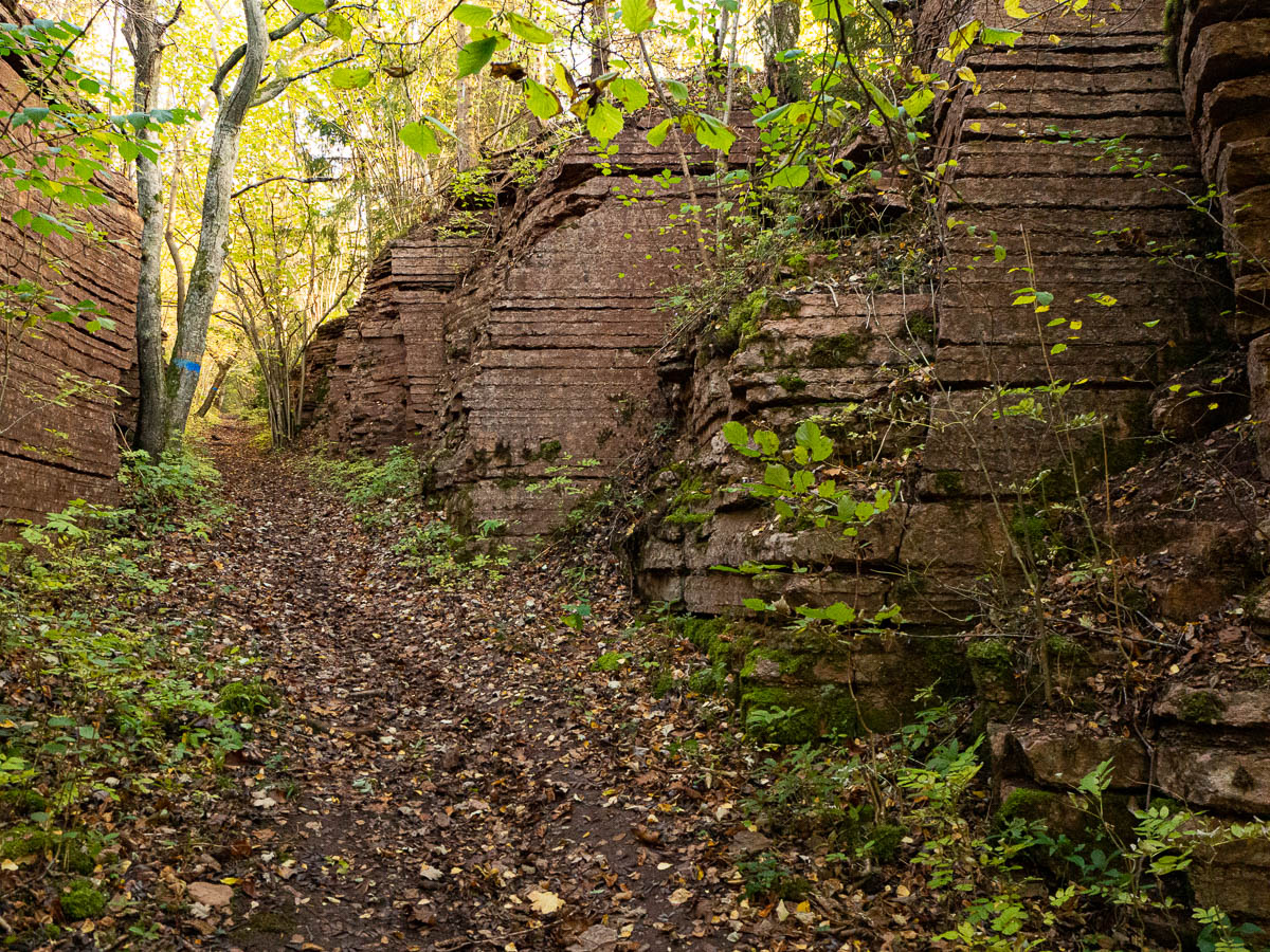 From the harbour the path goes through deciduous forest, following the tracks of an old tramway, straight like an arrow, to an old limestone quarry.