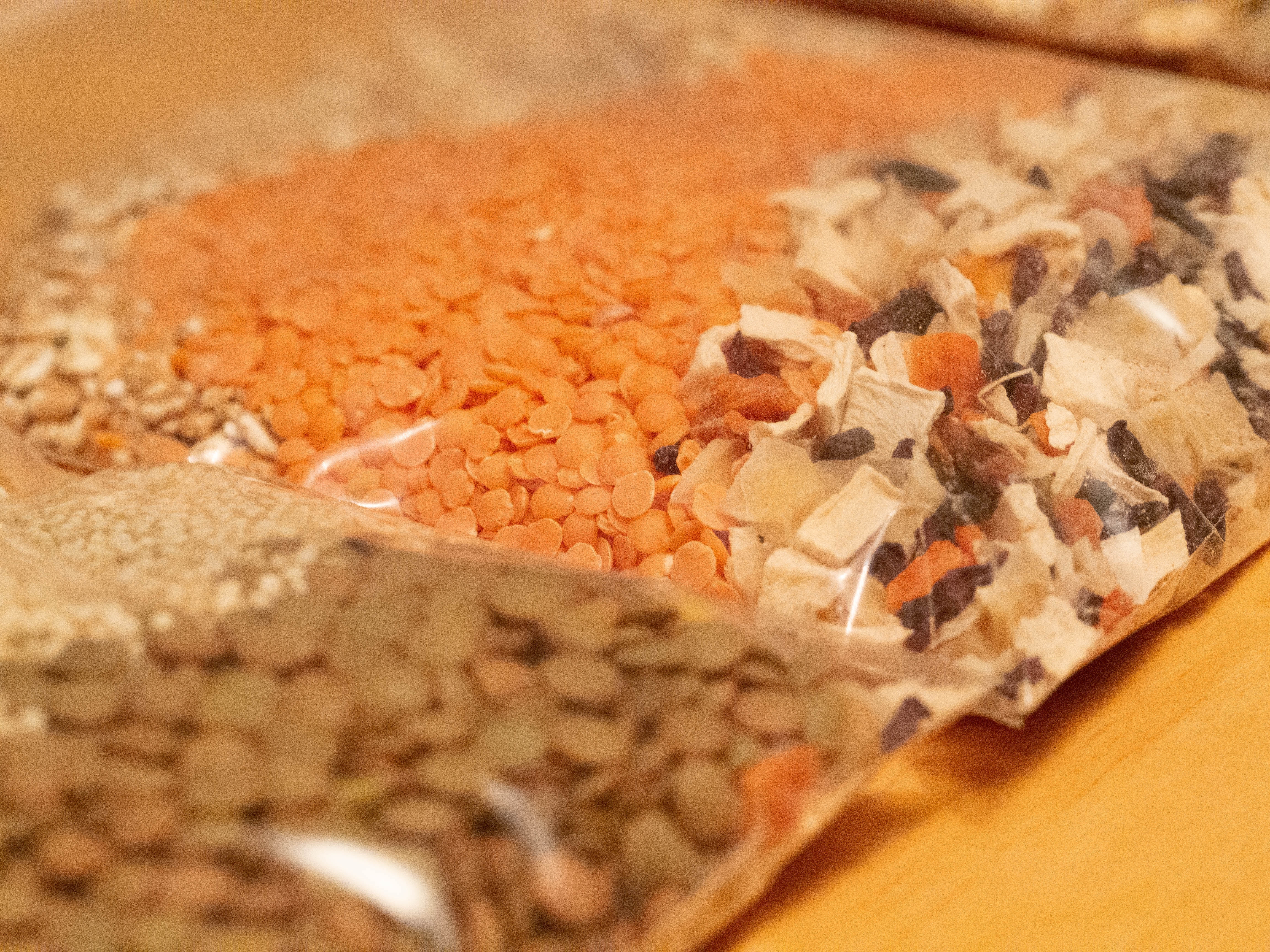 Pick any kind of grain that cooks in about 10 to 20 minutes, and combine it with any kind of lentils that cooks in about the same time. It doesn’t matter too much if one of them ends up slightly overcooked. Add vegetables. I prioritized convenience this time and used a ready-made mix of dried “Swedish vegetables” from Friluftsmat.