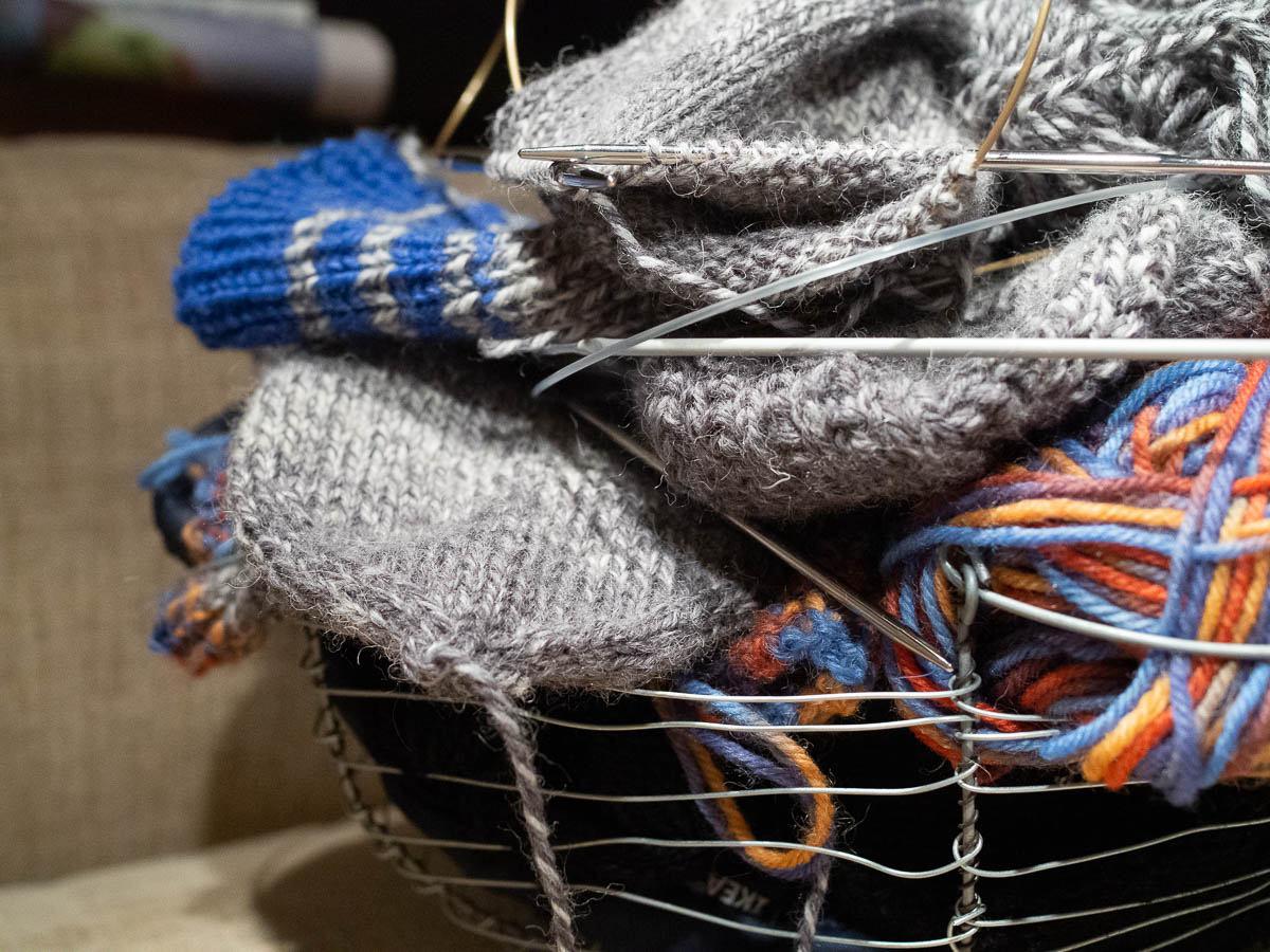 My knitting basket is overflowing with nearly-finished socks. First I knitted one pair, to give away. Figuring out the sizing took a few attempts, but the second sock went fast because I now had the pattern worked out for this exact size and this exact yarn.