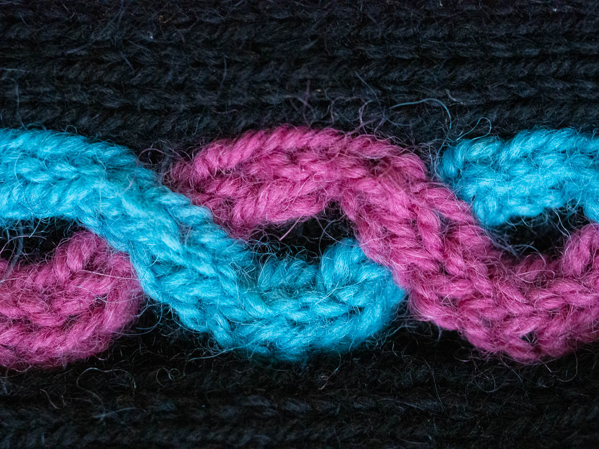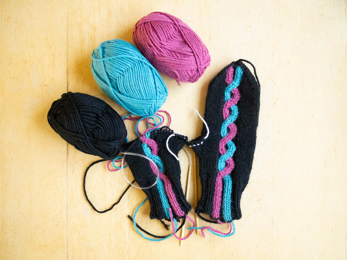 Nice easy patterns are quick to make but also kind of boring to knit, so I decided to add some cables to these mittens, inspired by another design I saw in a book. Then I had the idea of doing the cables in contrasting colours and when I pictured the result in my mind it looked so much better than what I saw in the original pattern that I just had to do it this way. I’ve never done intarsia cables before, but how hard can it be.