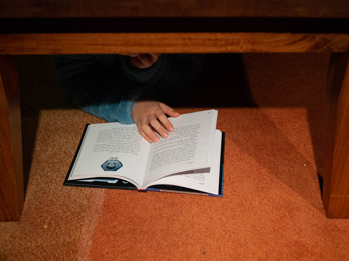 No, there is no bingo square to “read under the table”. I think this is for “read after dinner” – the spot under the table must simply have been cosy.