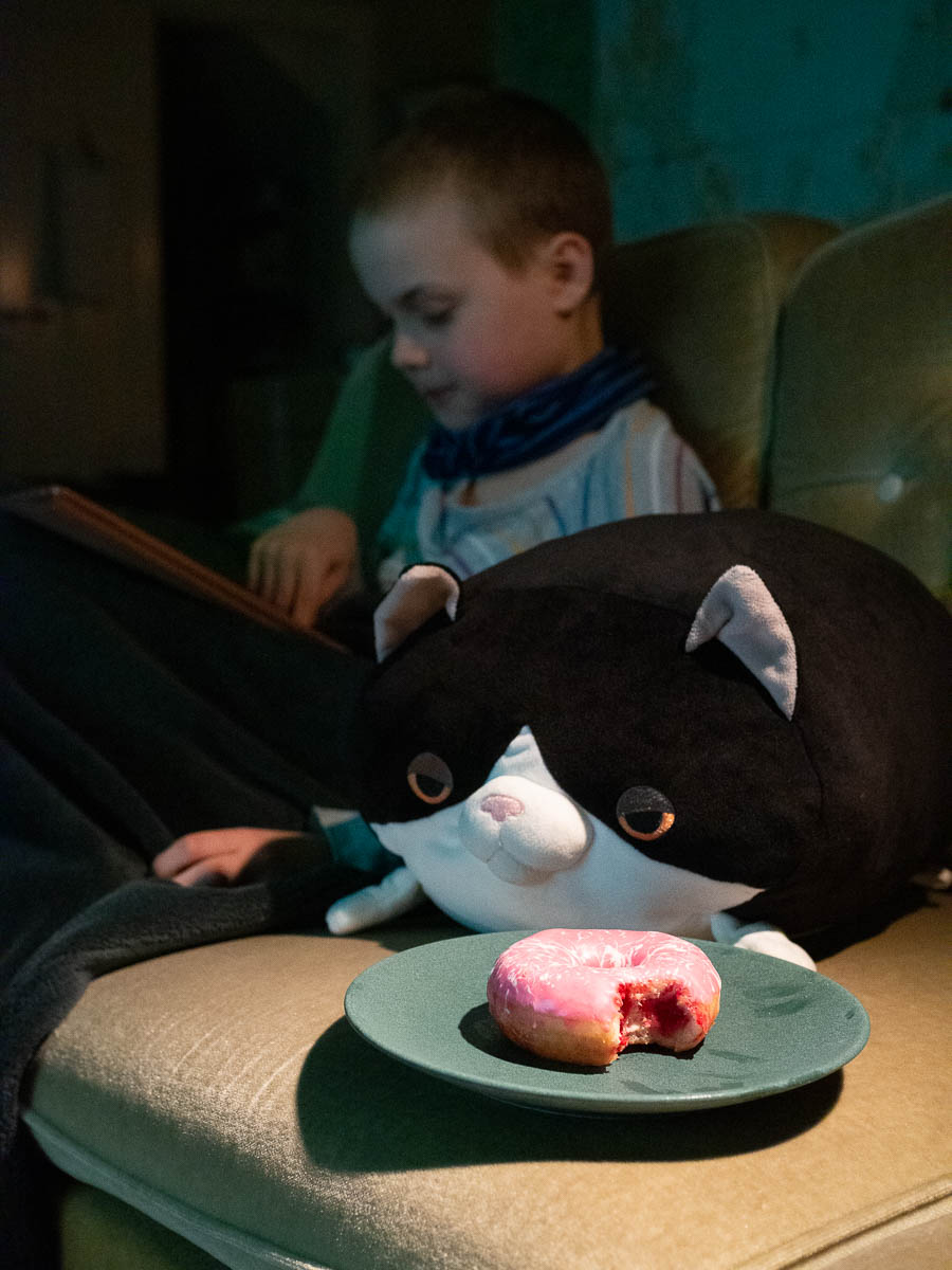 Today was the finals, which Adrian celebrated a Mello-pink donut. (The previous, less important shows only merited pink Mello smoothies and sometimes just fruit snacks.)