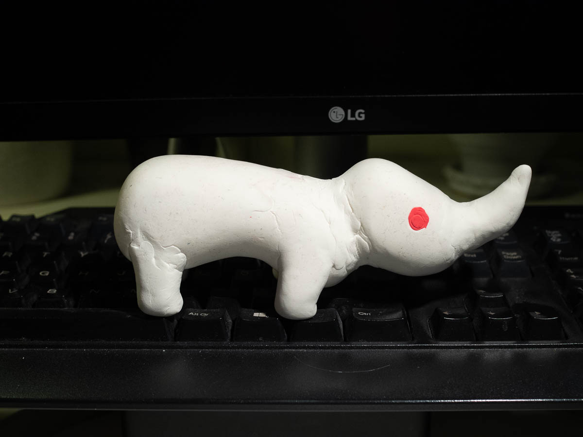 Adrian made this rhino sculpture, liked it but had no use for it, so he gave it to me. Now it sits on my desk because I also like it but have no real use for it.