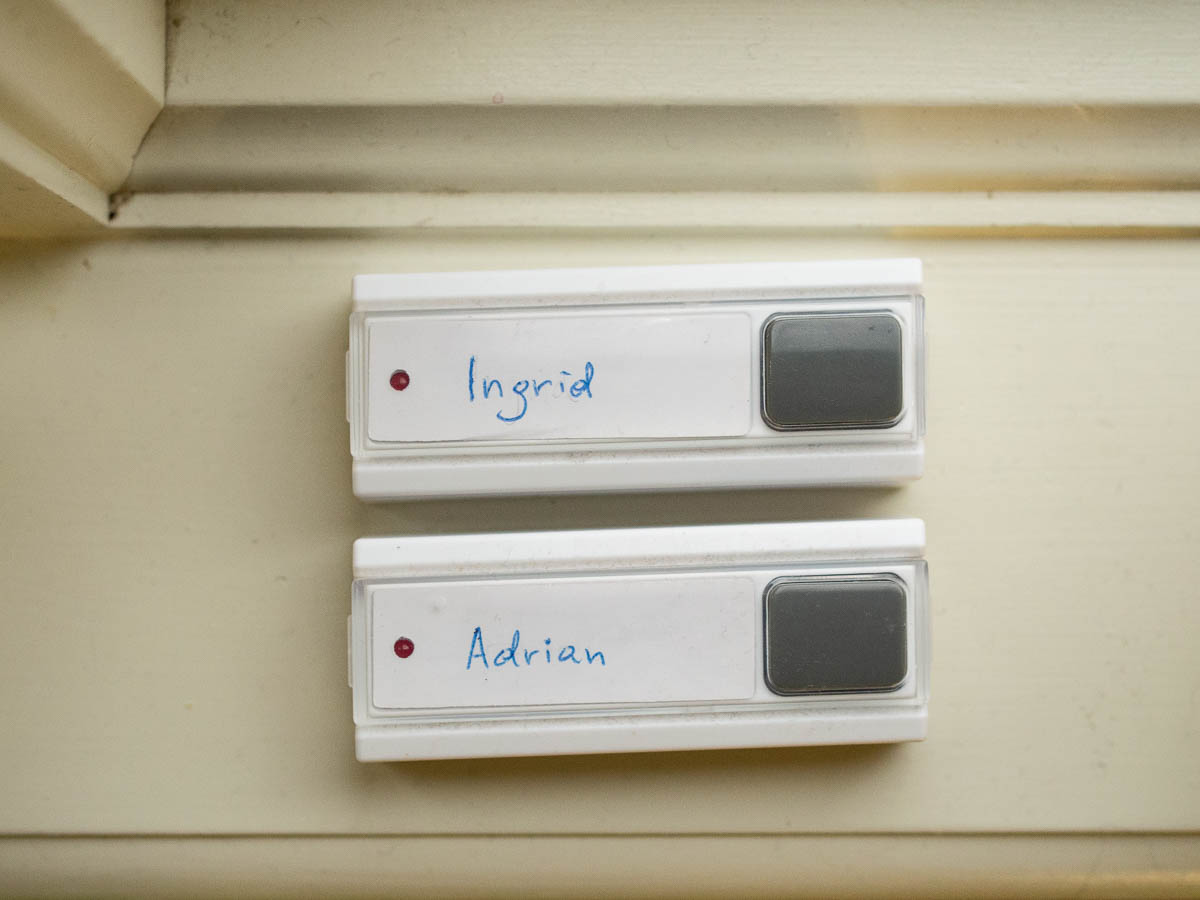 The obvious, practical solution to this was a pair of remote-operated doorbells. The buttons are downstairs in the kitchen, next to the singing bowl. The bells themselves are upstairs in Ingrid’s and Adrian’s rooms. They each chose their own ringtones. One sounds like a bunch of birds tweeting; the other is a more traditional melody. Sort of like 19th-century servants’ bells, but the other way round.