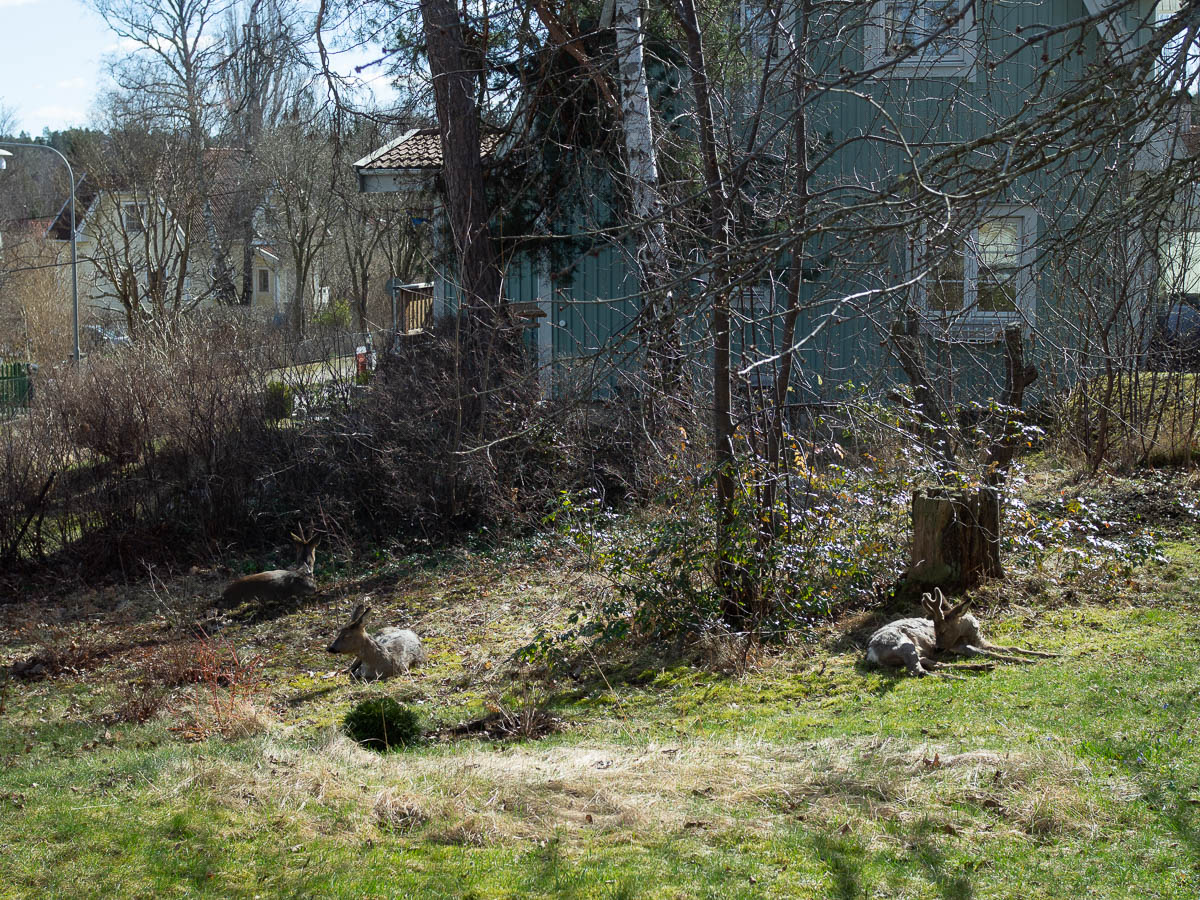 Three deer lazing around in the spring sunshine in the garden. Clearly feeling right at home here.
