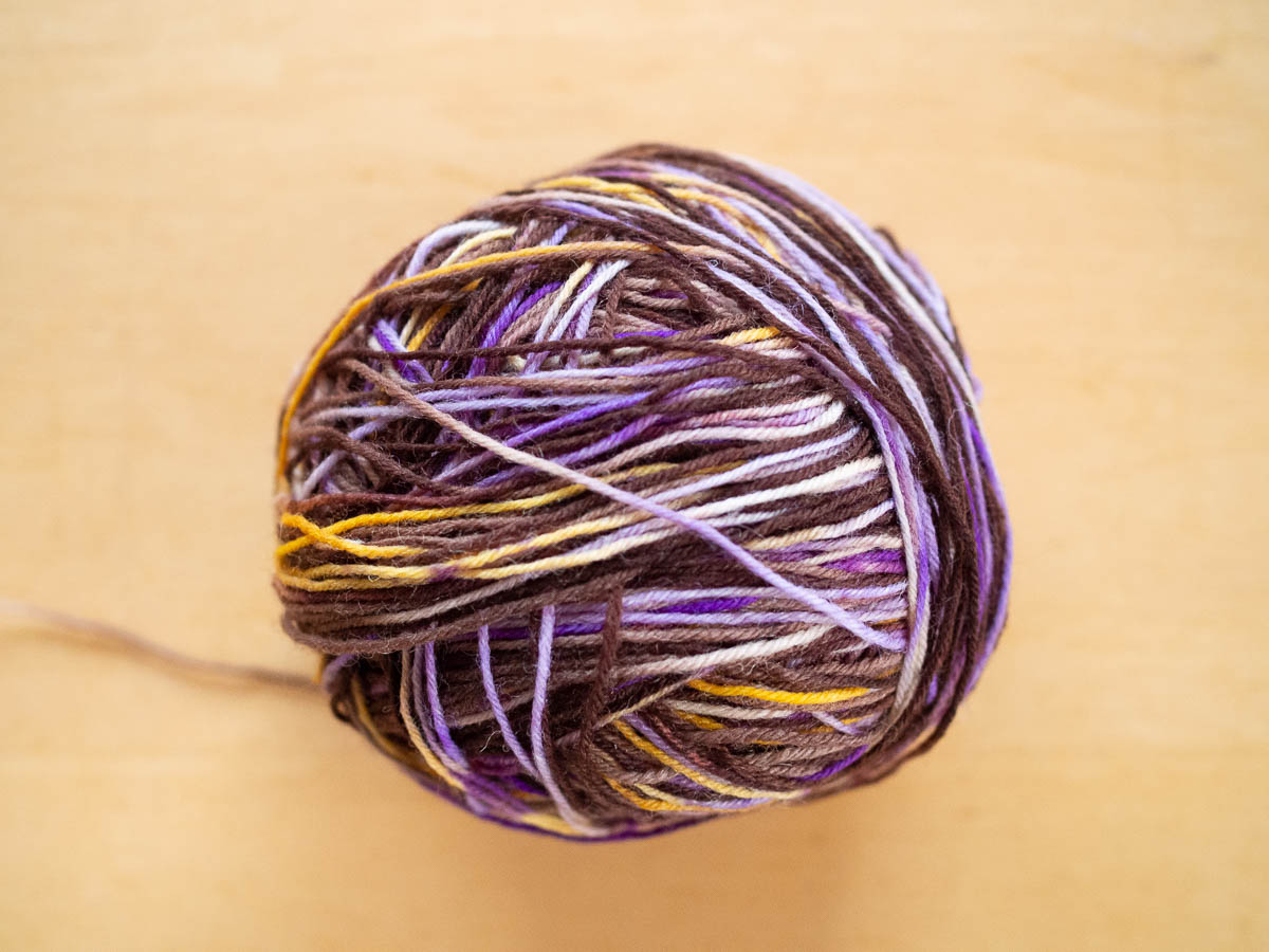 I’m peeved that I didn’t think to take any photos of the hanks of yarn before I wound them into a ball. But if you run an image search for hand dyed yarn then you can see what they generally look like. Imagine one of those in dark brown with blobs of white, dark yellow and violet. Like crocuses and spring earth.