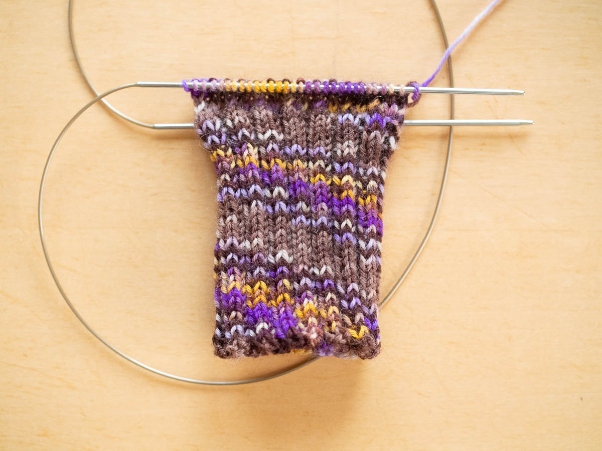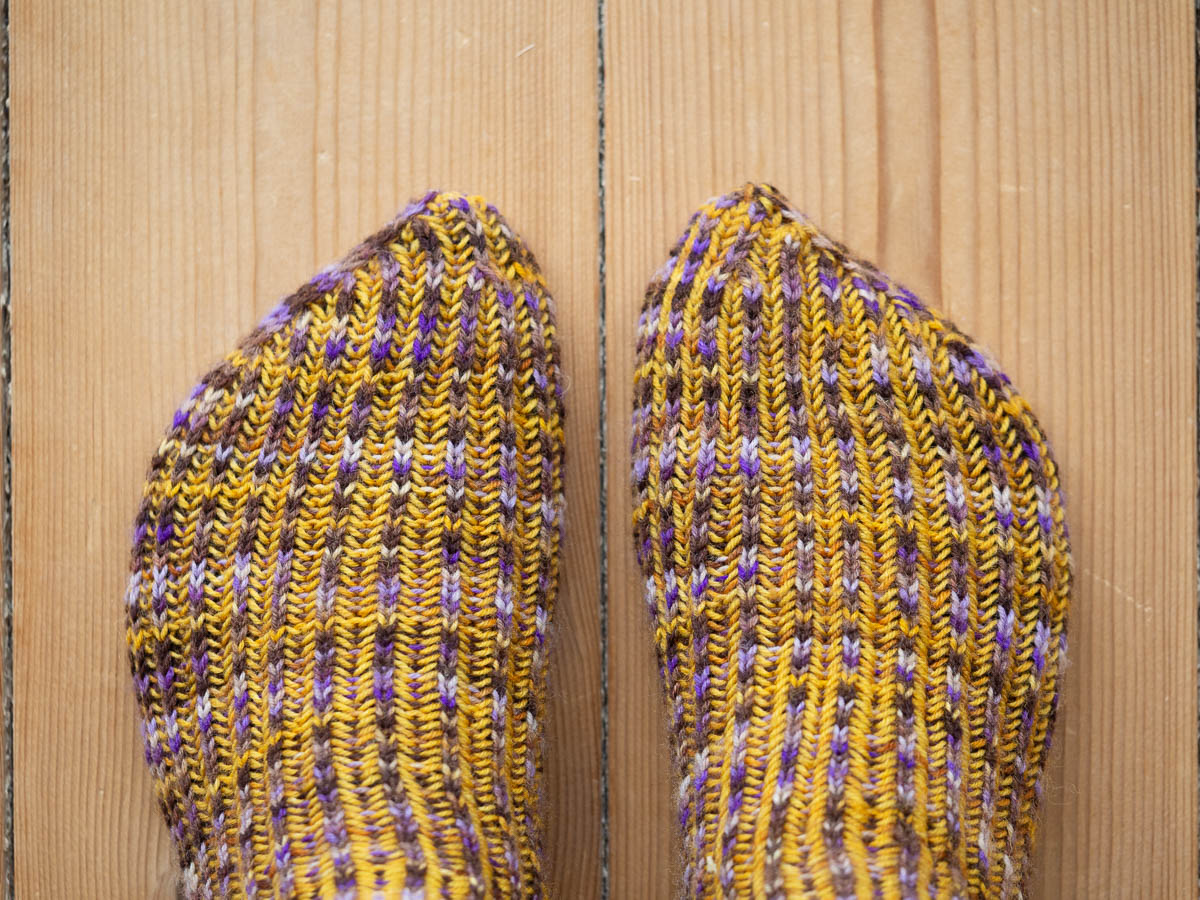I was somehow hoping that the colours would magically align themselves when I knit the yarn into socks, so I would get distinct splodges of yellow and violet again. An evenly speckled result would also have been nice. But instead the colours only kind of pooled, and I got these awkward, sharp-edged spirals of colour instead. Maybe it doesn’t look too bad in a photo but in real life I found them quite garish and ugly.
