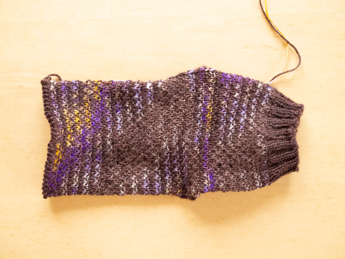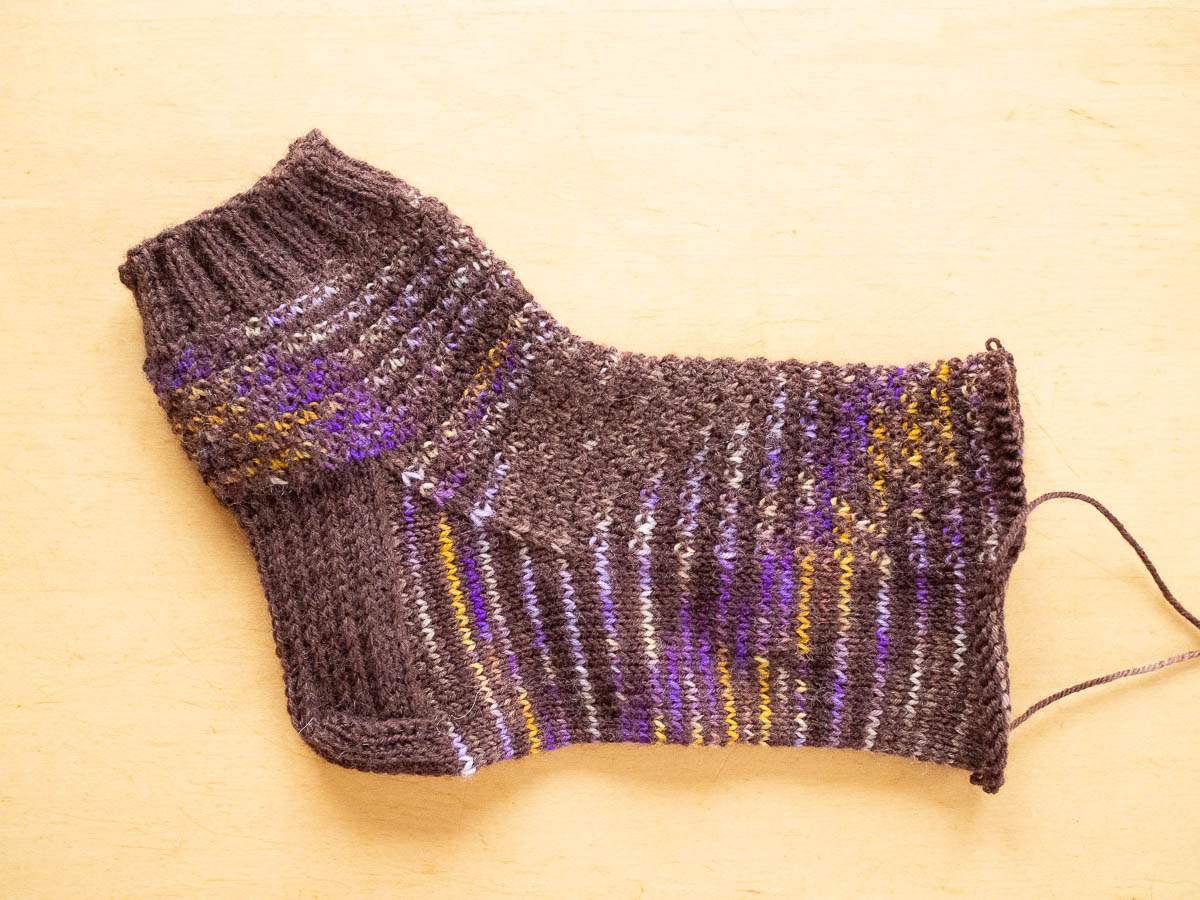 Not bad, until I straightened out the socks to start knitting the toes, and realized that almost all the coloured parts ended up on the sole of the foot, and the yellows and violets only reached the front of the foot at the very end. So the crocuses would all be on the sole of the foot, and I would actually mostly see muddy earth.