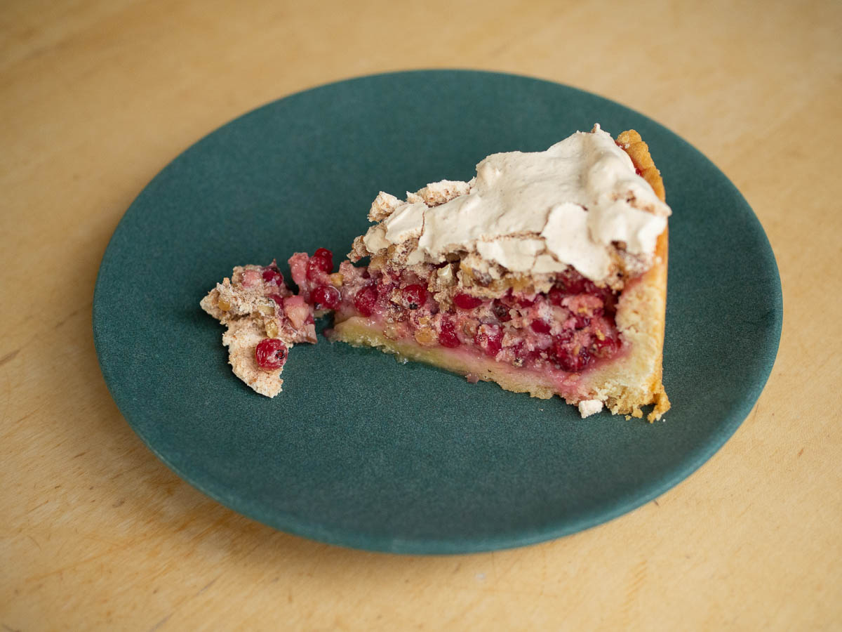 My mum was able to locate that old recipe for redcurrant cake and Eric was kind enough to make it for me. This, this is what the cake is supposed to be like! A deep crust properly filled with lots of redcurrants – three times as much as the other recipe! Meringue mixed in with the berries, and chopped hazelnuts as well. I had completely forgotten about the nuts but now that I can taste them there, I realize what a difference they make. And the meringue itself is slow-baked so it’s crunchy and crumbly instead of sticky. I’ll be holding on hard to this recipe.