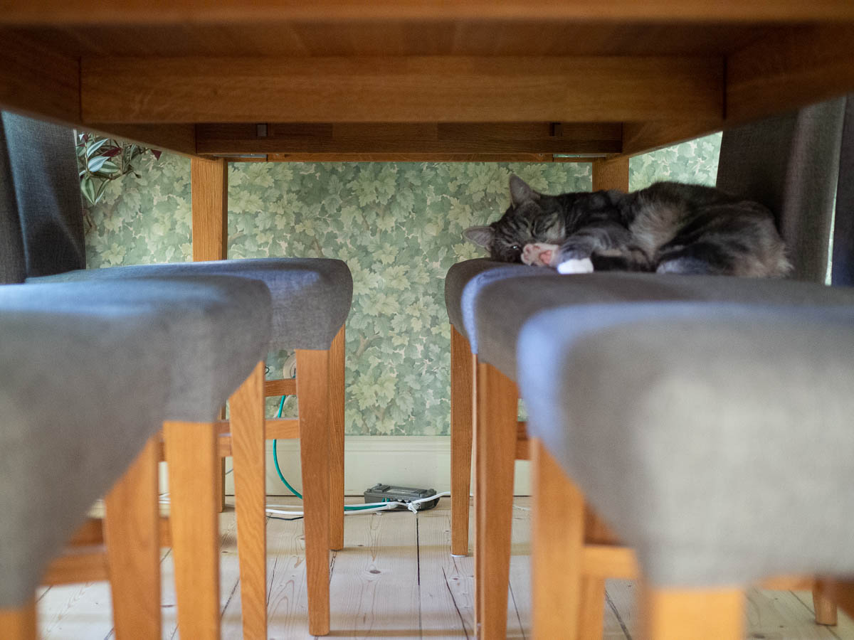 The neighbourhood’s outdoor cats often walk across our deck and past our French doors. Some are aloof and distant, others more curious. Very occasionally, a few come inside. The ones who start scratching at furniture get immediately put outside. This one just walked inside, looked around for a moment, and found itself a sleeping spot. And then stayed there. It’s a good thing I saw it come in, because otherwise I probably wouldn’t even have noticed it sleeping there, well hidden under the dining table, so I would have locked it in when I left the house for my midday walk.