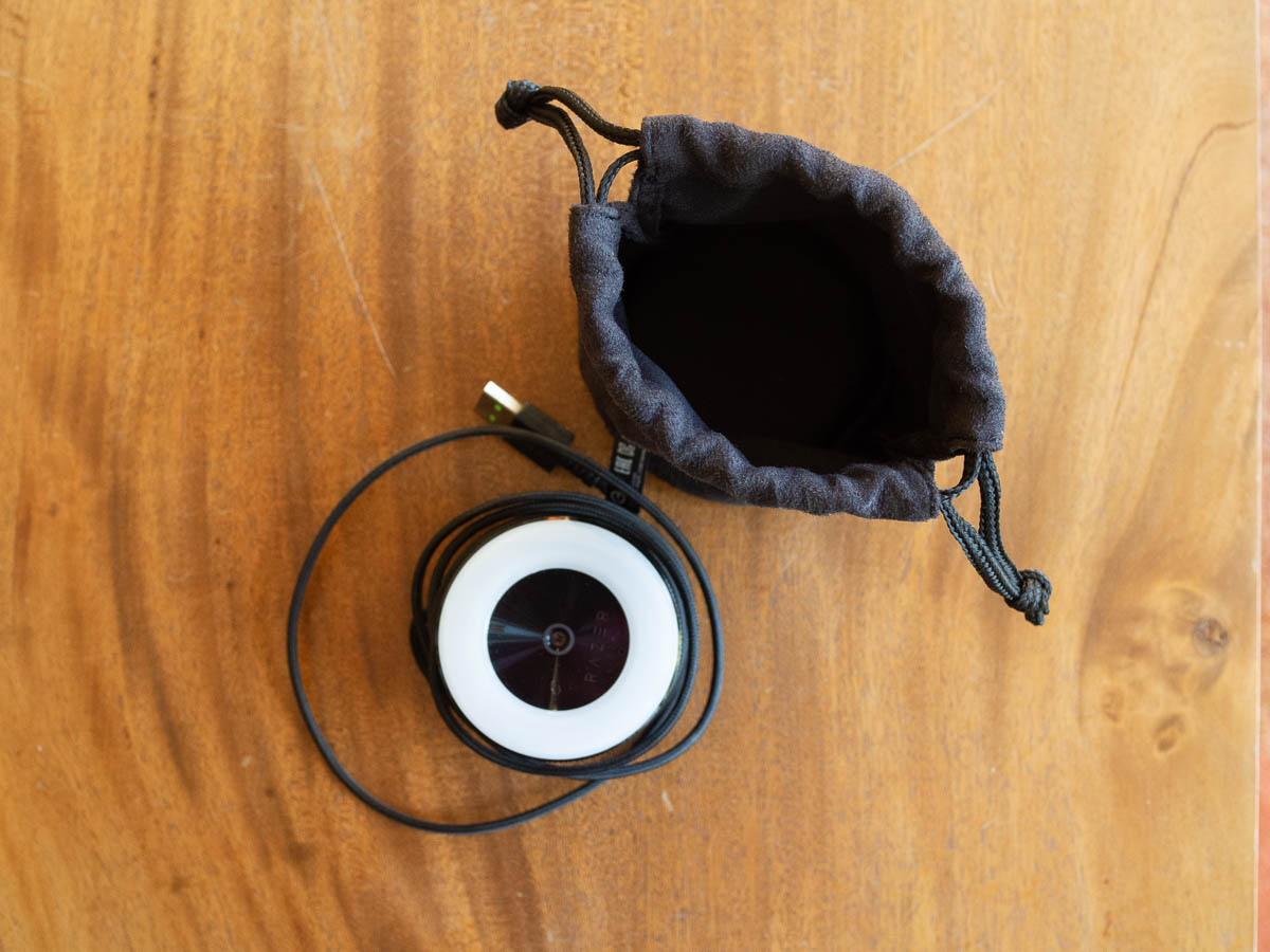 It turns out that my webcam fits perfectly inside the lens bags for my old Nikon lenses. The bags are just the right size and shape, and soft and padded of course. I lost the camera and its lenses in the burglary four years ago but I still have the lens bags. They’re well-made so I didn’t have the heart to throw them out. Now they come in very handy.