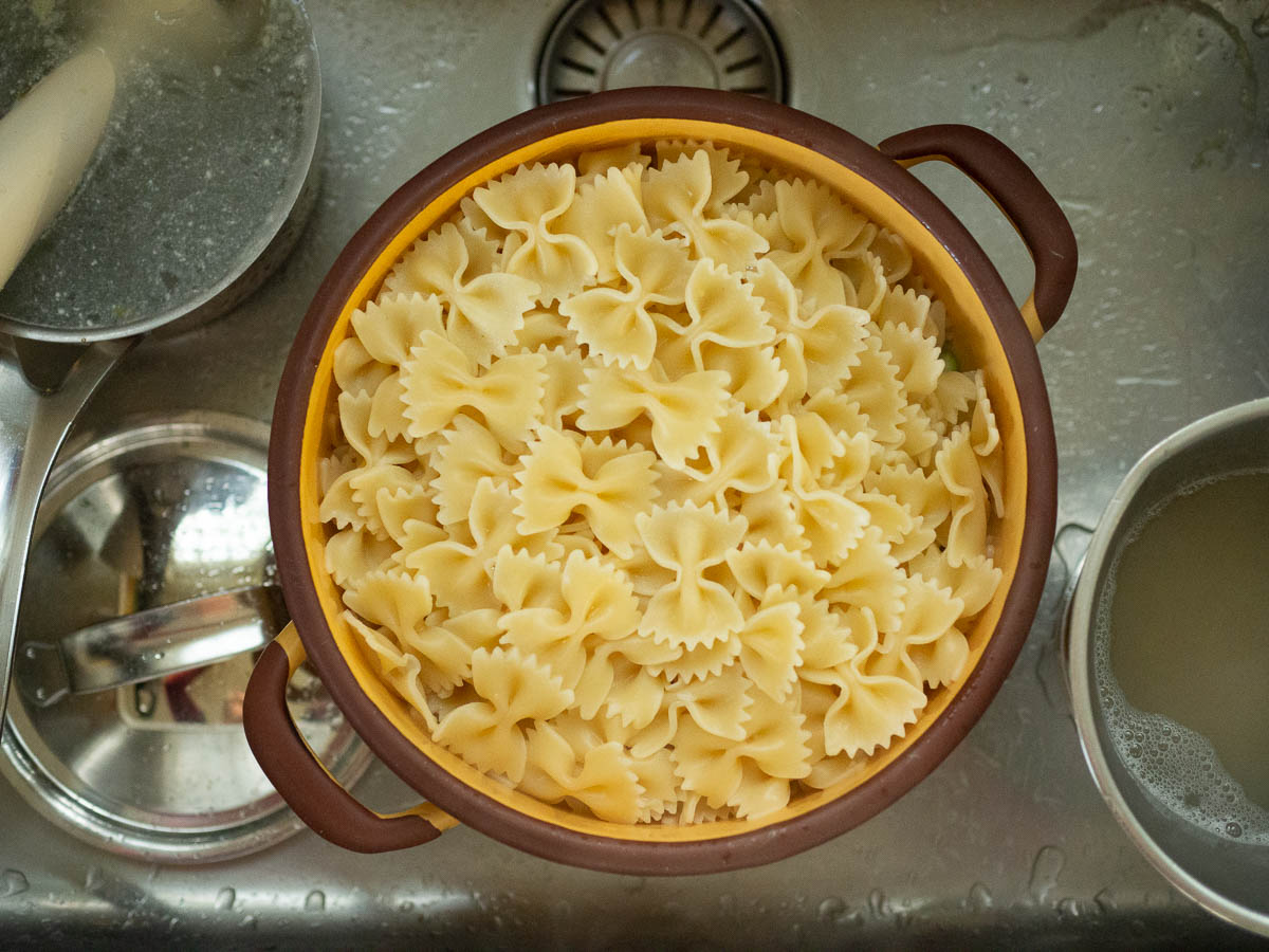 Not for the first time, I wonder how people with larger and/or hungrier families manage to cook dinner. 500 g of pasta just barely fits in a standard strainer. I can just about fit noodle stir fry for four in our largest cast-iron pan if I’m really, really careful when stirring. It’s a good thing I no longer need to eat quite as much as I used to – I balance out Adrian’s and Ingrid’s appetites (Adrian growing, Ingrid going to the gym).