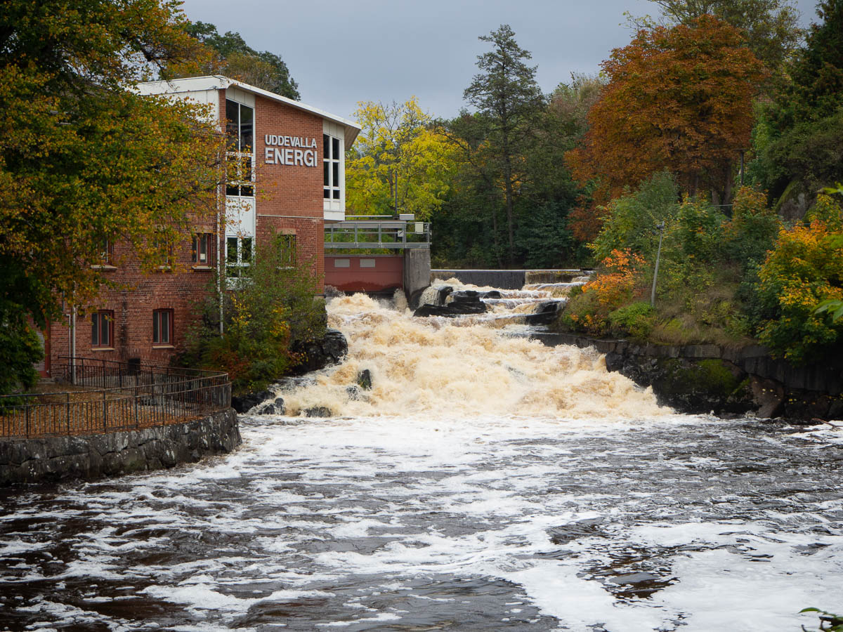 The path followed the river all the way from one side of Uddevalla to the other – past waterfalls, through the city centre, and then through a harbour. Along the way I read interesting information plaques, as the tourist I was, about how the river was used to power sawmills and power plants, about the funeral procession of Karl XII passing through Uddevalla, and about the fire that devastated the city in 1806.