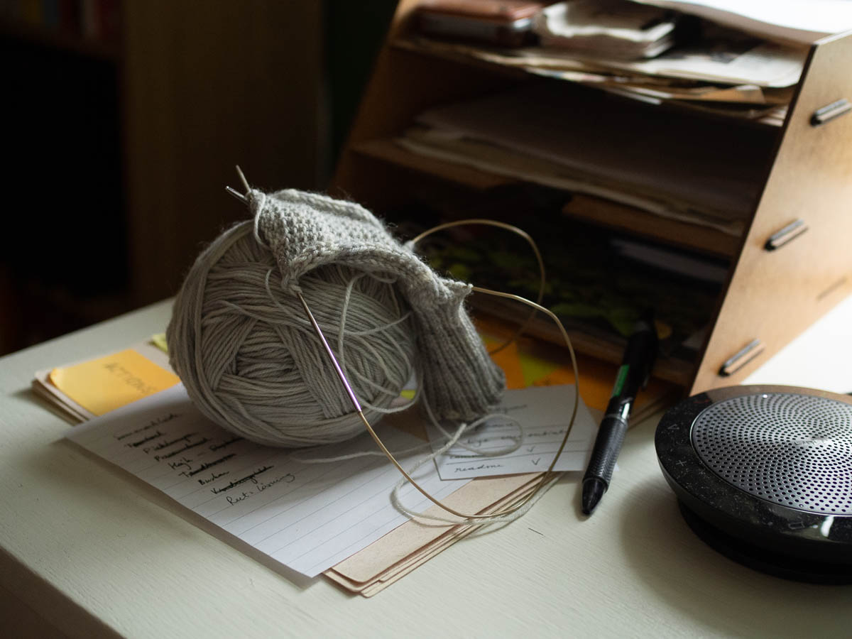 My knitting is as much part of my daily work equipment as my conference speaker and web camera. Although not quite as much as my mouse and keyboard. Online meetings without knitting make my whole being itch with impatience.