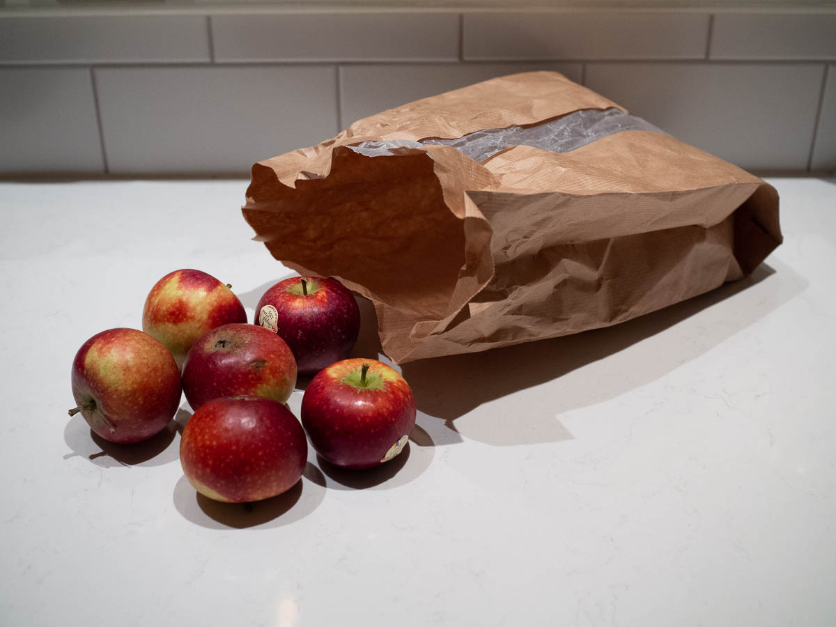Except when I leave my purse at home because I have my backpack for some reason… and then I have to use something else for the apples I buy. Single-use plastic bags are still available but on their way out, and most shops offer paper bags instead.
