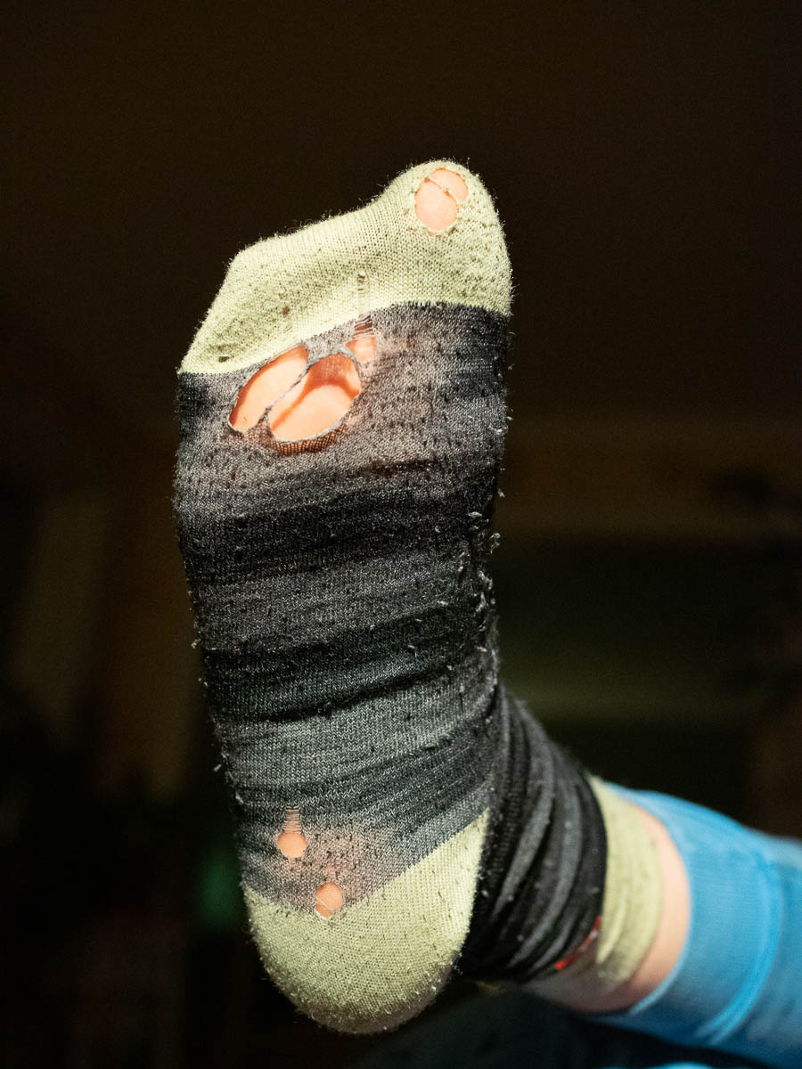 I get fond of my woolly socks and mend them over and over again. Adrian takes it to a whole other level with his favourite socks and shirts. Except he skips the mending part.