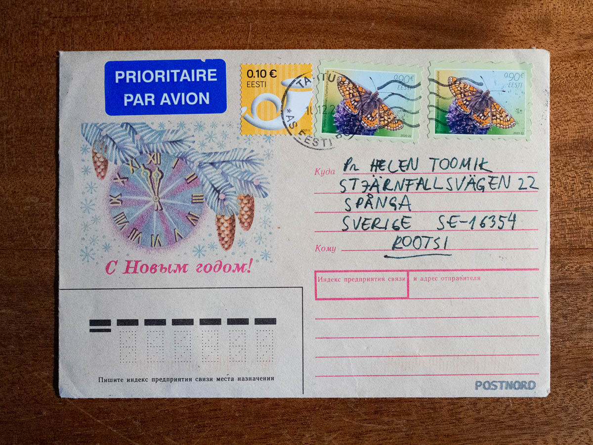 One card stood out because of the envelope it arrived in – a Soviet-era envelope from 1987, with a New Year’s Eve celebratory design. Complete with boxes for filling in the postal code in a standard way, down at the bottom left. (The flap of the envelope has examples of all ten digits, so that the boxes get filled in correctly.) The boxes for postal code have existed for as long as I can remember, and clearly at least since 1987, so I guess they had OCR for sorting mail already back then?