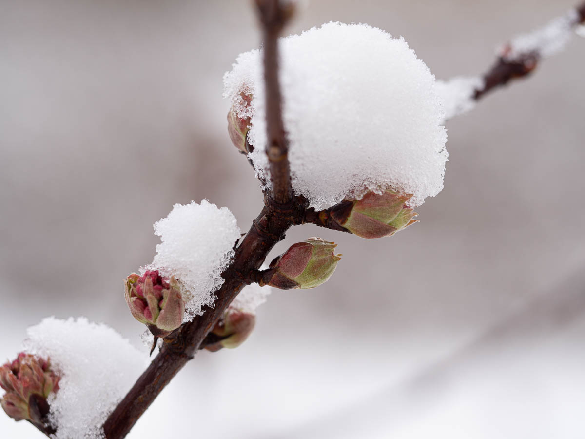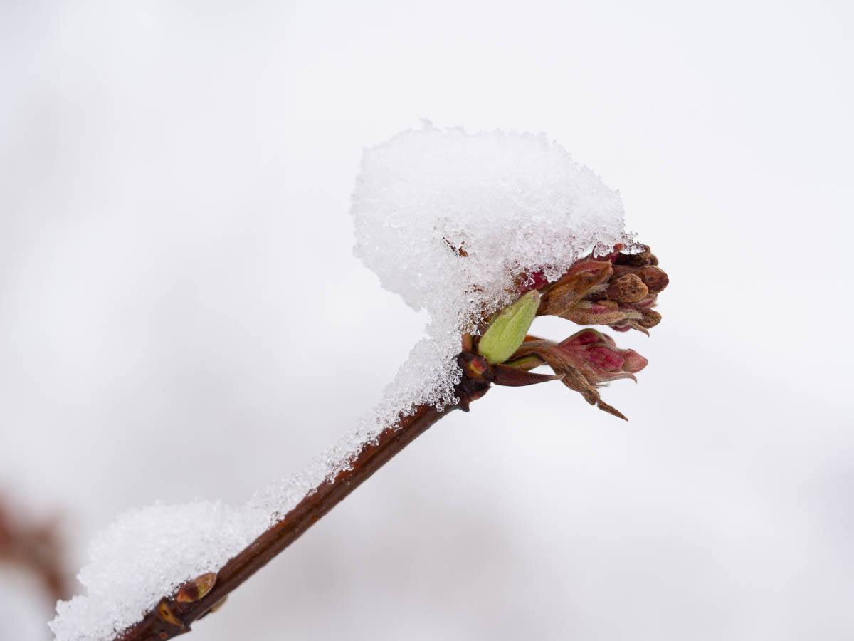 I keep taking photos of Viburnum buds almost every year, and it never gets old. I love the contrast between the vibrant pink and green of the buds and the stark white of the snow, and the tender softness of one and the sharp coldness of the other.