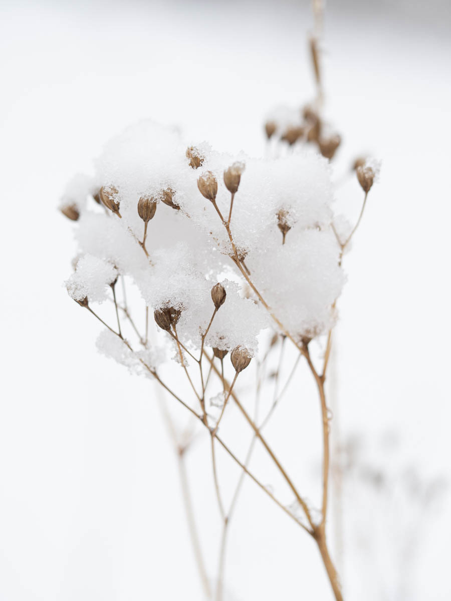 It’s also fascinating to see just how much snow can clump up and be supported on almost nothing. That seed head is almost all air, just a few thready, wispy stalks. If I tried to put things there and make them balance, I’d probably break the stalks and drop everything. But when fluff gets to settle there naturally, it works.