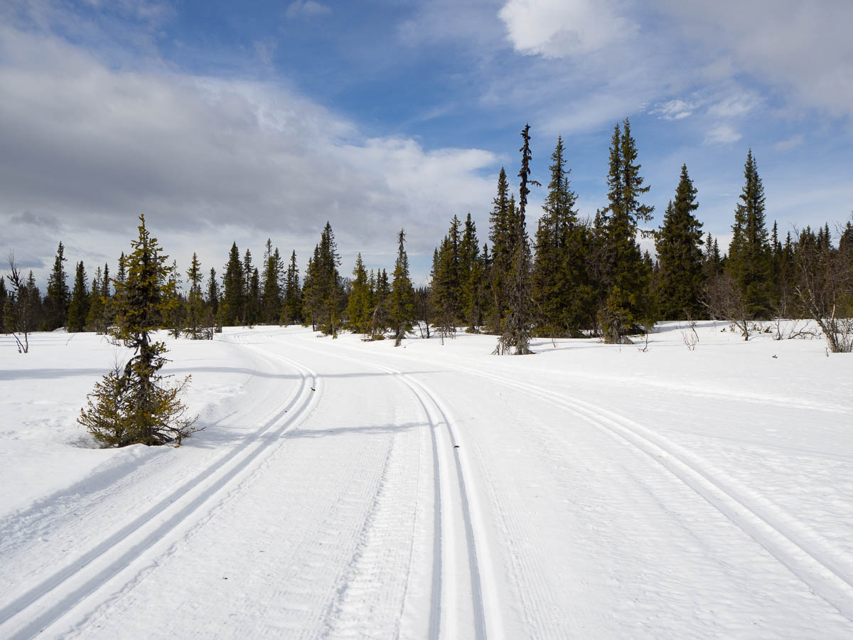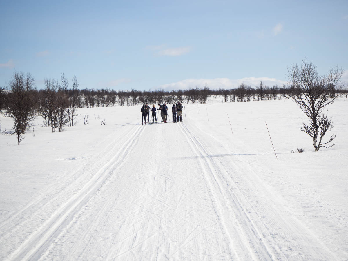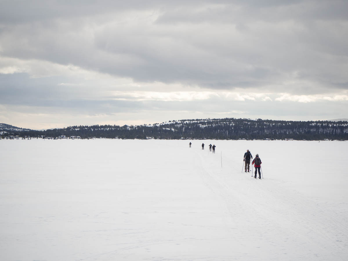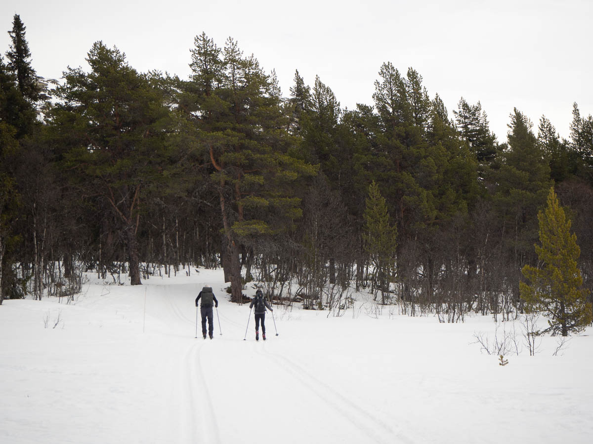 Due to the freshly groomed tracks (most of the way) we actually had really good snow today. But also a lot of other people, now that we’re so much closer to civilization, of all kinds. There were some on backcountry skis like ours, but many were out with no packs and on their skinny little skis, racing along like the wind. Also several bunches of serious skiers in matching lycra outfits and with matching brightly coloured poles, racing along even faster.