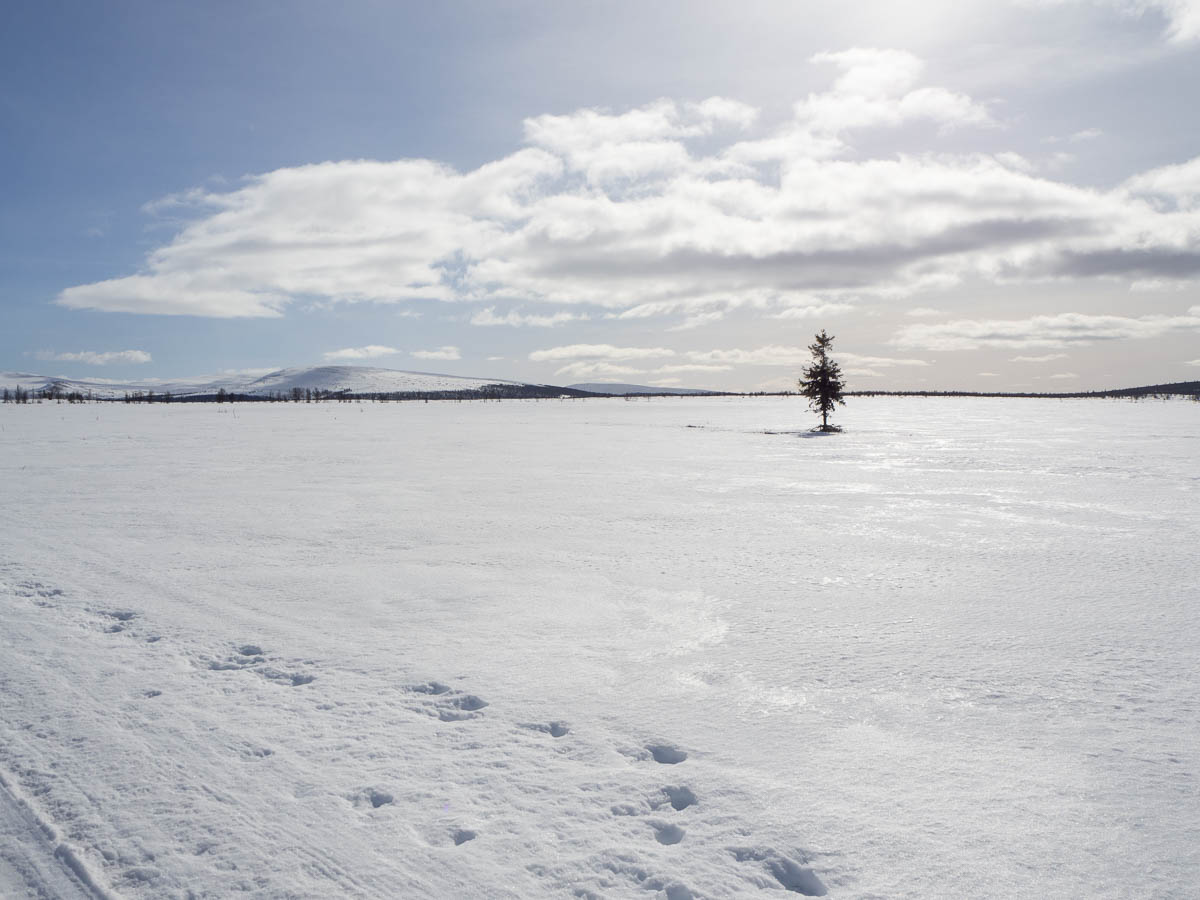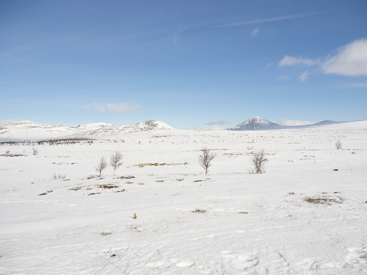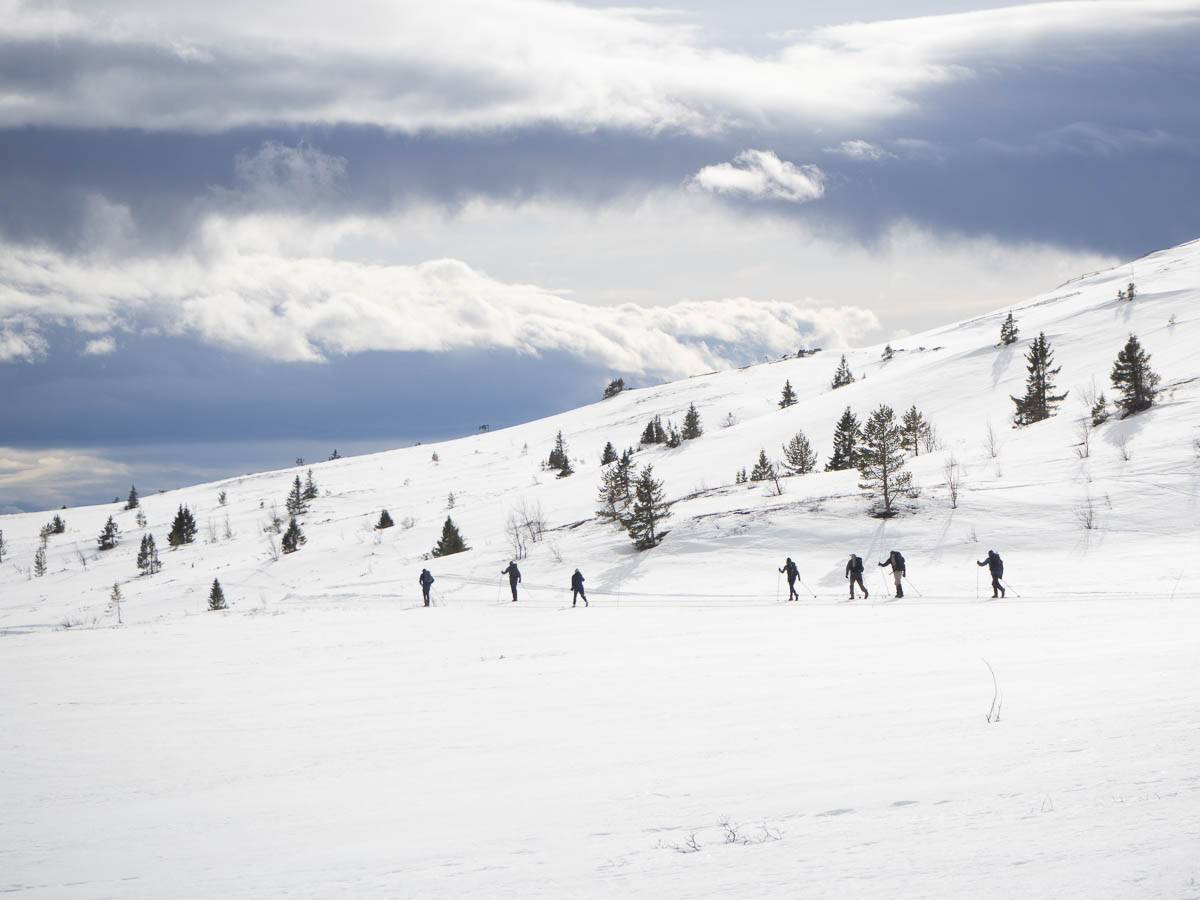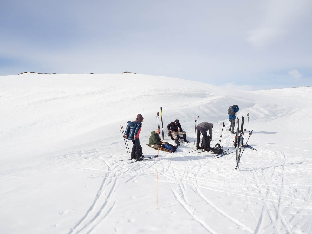 Due to the freshly groomed tracks (most of the way) we actually had really good snow today. But also a lot of other people, now that we’re so much closer to civilization, of all kinds. There were some on backcountry skis like ours, but many were out with no packs and on their skinny little skis, racing along like the wind. Also several bunches of serious skiers in matching lycra outfits and with matching brightly coloured poles, racing along even faster.