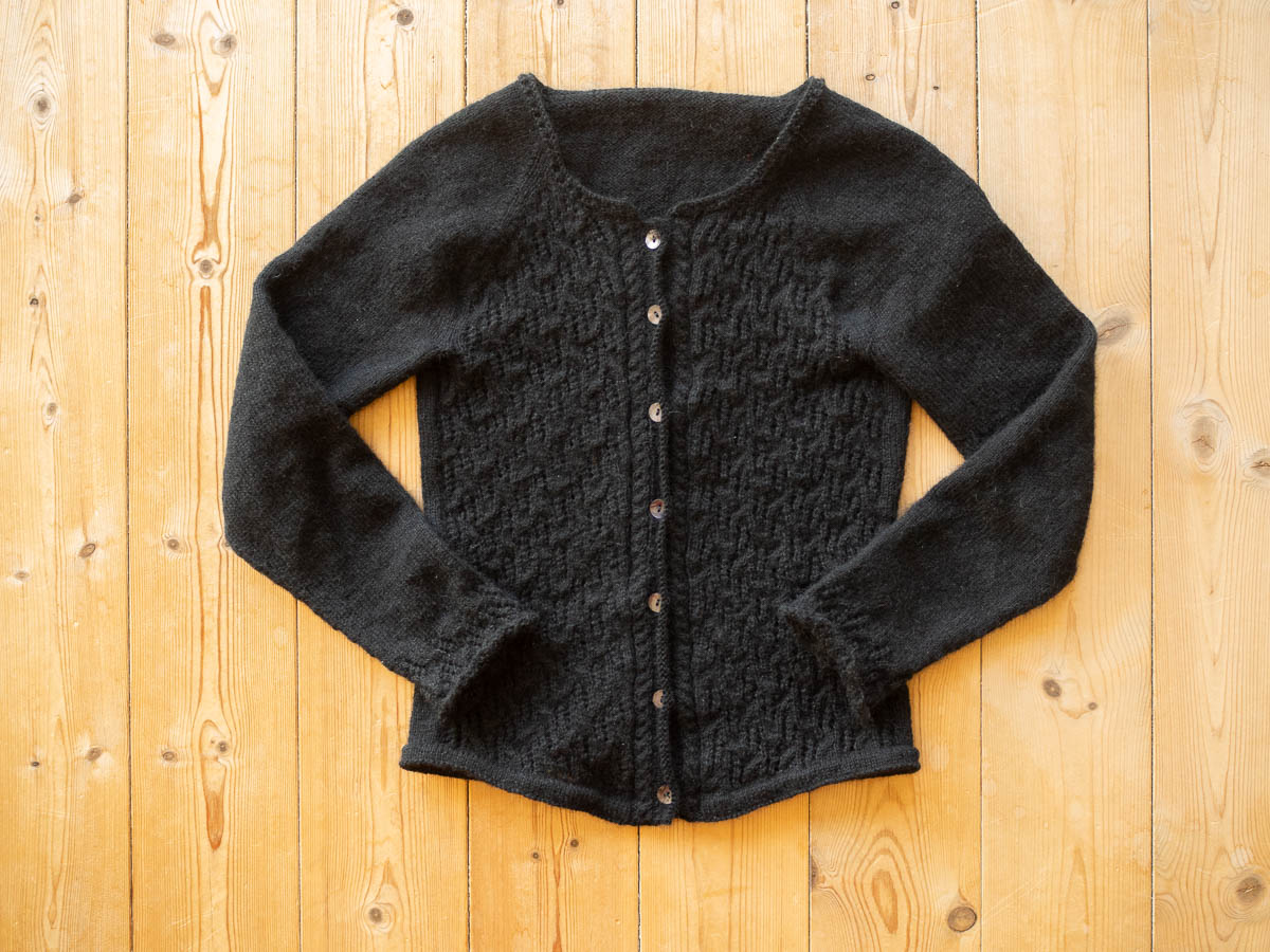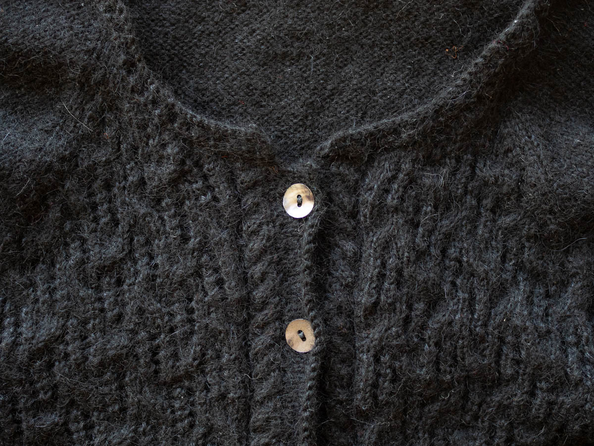 Overall it came out really nice. The lace looks pretty and has good definition even in the black, fuzzy yarn. The fit is good, my pattern tweaks mostly worked out, and it feels super soft and fuzzy without being too warm. I already started wearing it before I had the buttons in place because it’s just so cosy.