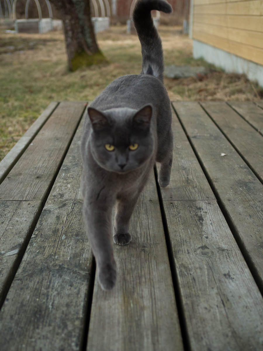 Today was sunny and hot. It feels like spring is here. Nysse was off exploring for hours, then came back and went out again. He seemed to really enjoy the warmth. I tried to catch him basking in the sun, but the moment he saw me, he always came over to see what I was doing. So I only got semi-blurry photos of him prowling closer to explore the camera.