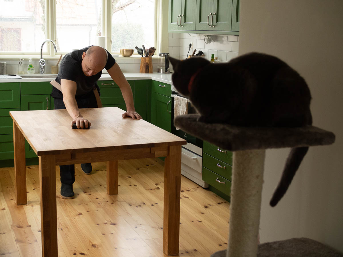 Eric was re-sanding and re-oiling the kitchen table. It’s not as moisture-resistant as it could be.