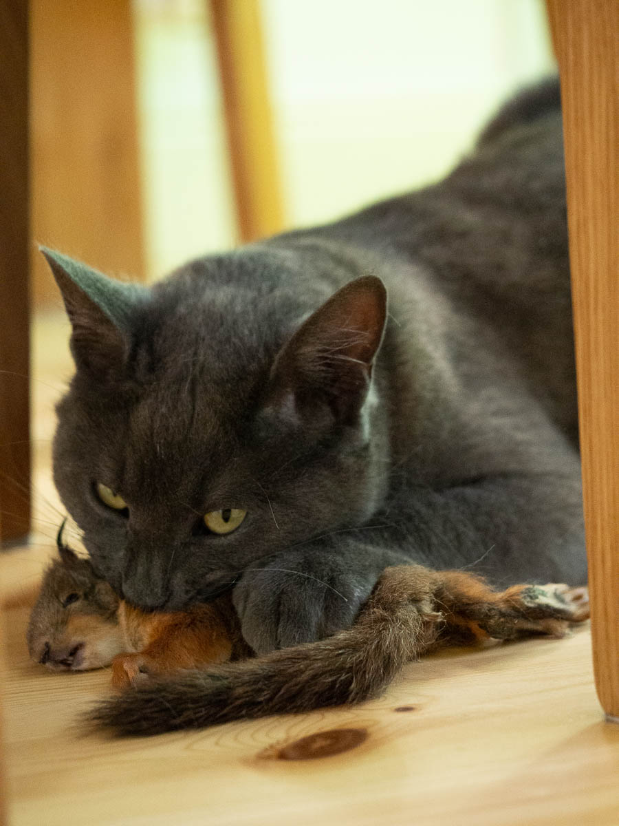 I had meetings all afternoon so I didn’t see what he did with it. Only afterwards I found the squirrel’s tail but not the rest of it. Either he took it out of the house again, or ate it without a trace, or hid it somewhere. I hope it’s not the latter. He doesn’t usually hide things, luckily.