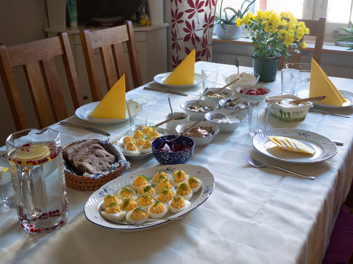 Devilled eggs, herring of various kinds, fake vegetarian herring, and assorted side dishes.