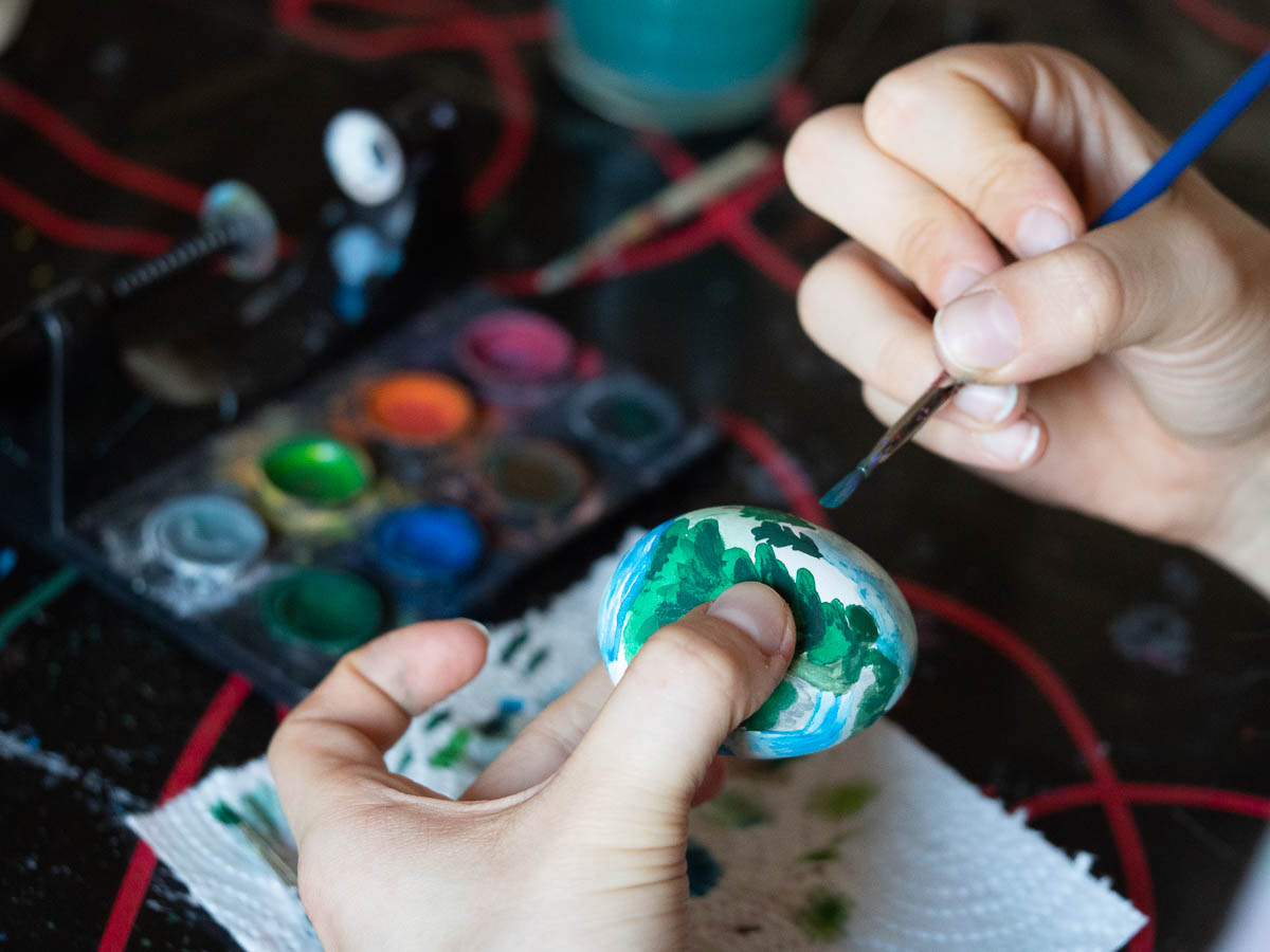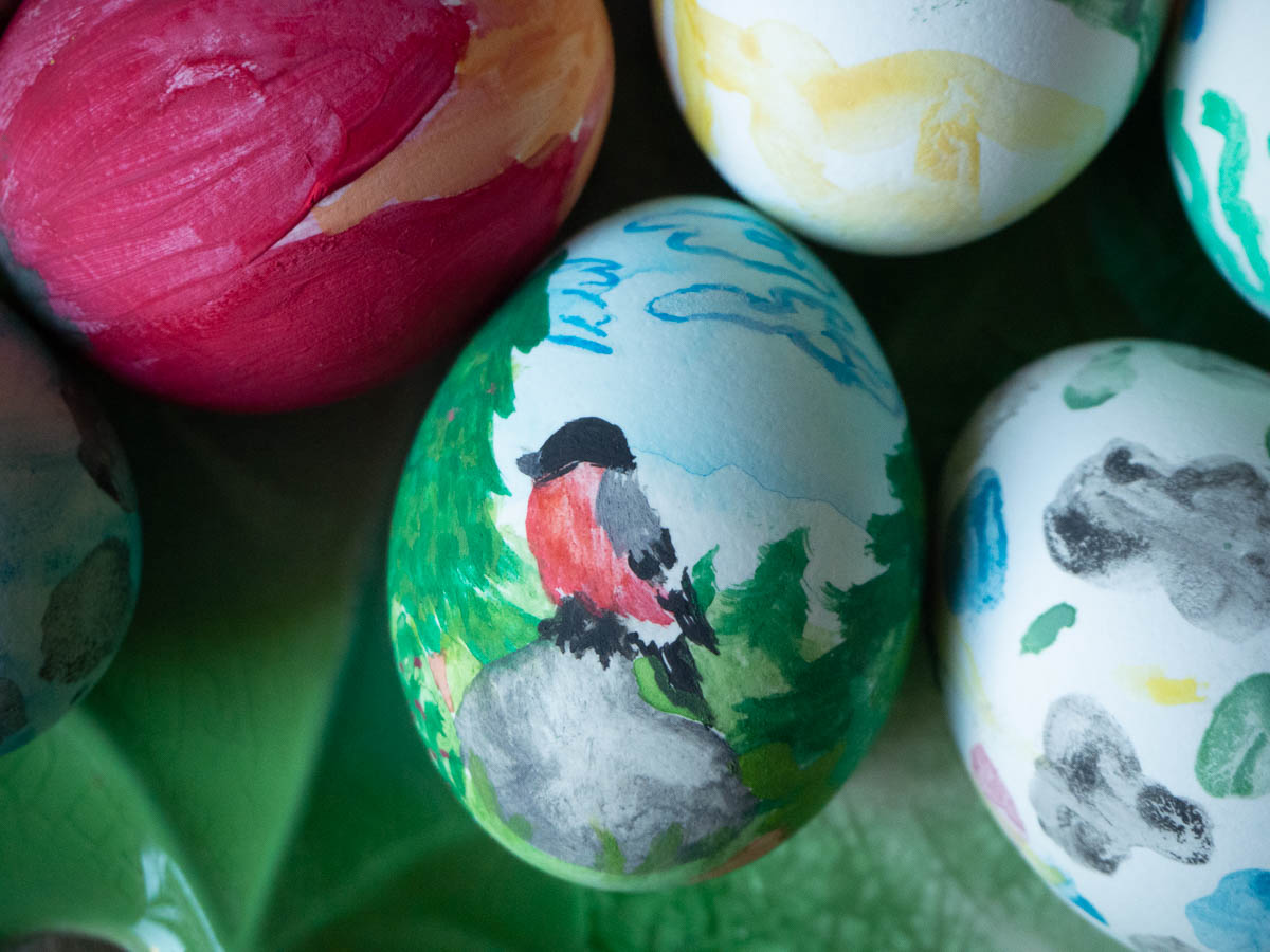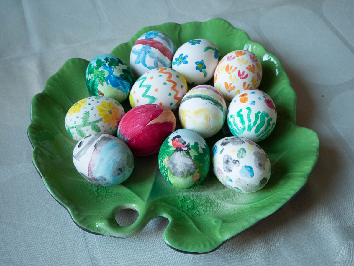 Painted Easter eggs. My mum and I manage stylized but recognizable objects, and pretty patterns. Adrian does his own thing. Ingrid is the only one who actually practices painting and therefore makes more and more impressive designs each year, with just 8 crappy colours.