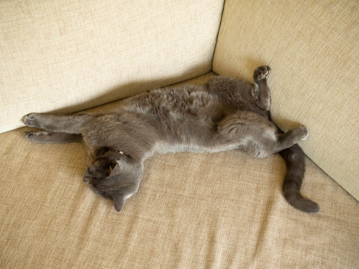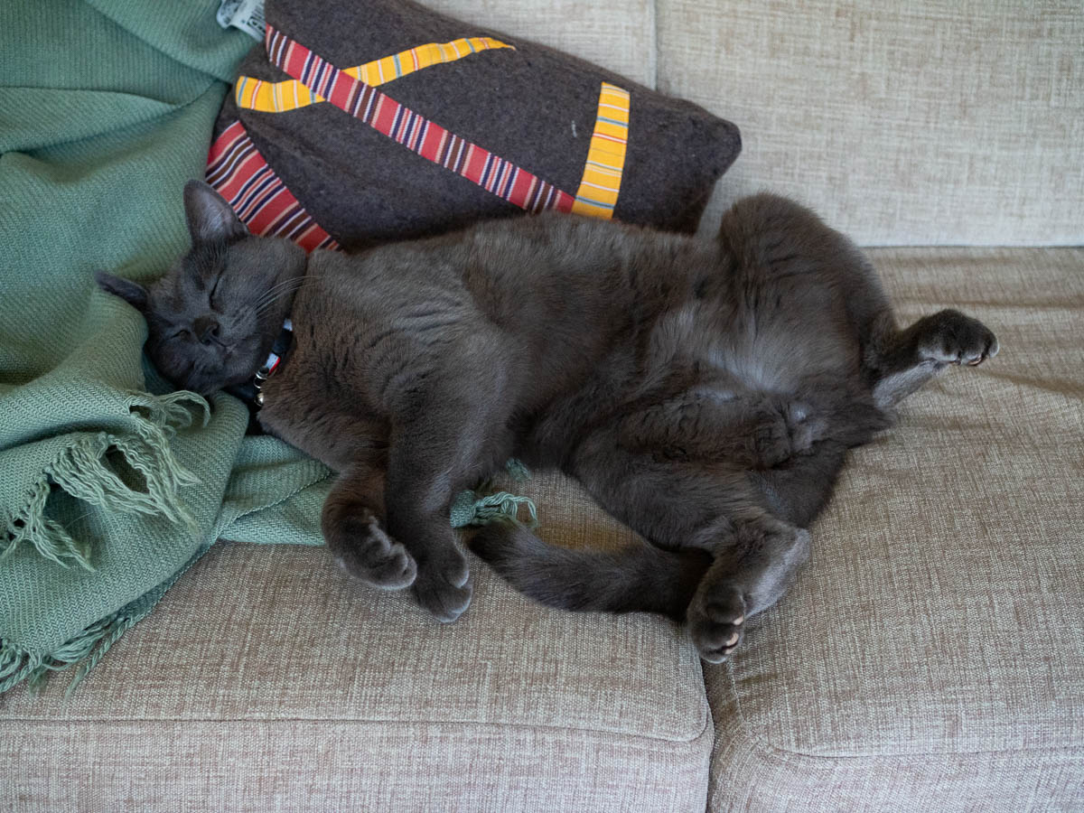 Nysse is willing to sleep on any softish thing on a flattish surface. Sofa, someone’s lap, carpet, a fleece hoodie thrown somewhere, even a newspaper. I put a folded-up quilt on the sofa table for him, to make him leave my Saturday newspaper alone.