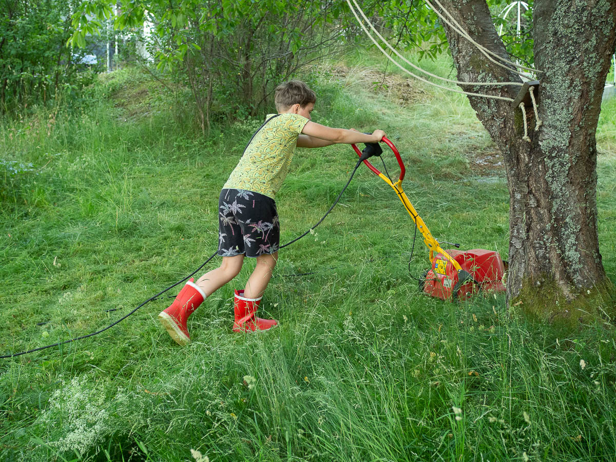 Ingrid did some mowing the other day to earn more money. Adrian also wants more cash, so he tried to do the same. But it was hard work. The grass is high, and most of our garden slopes.