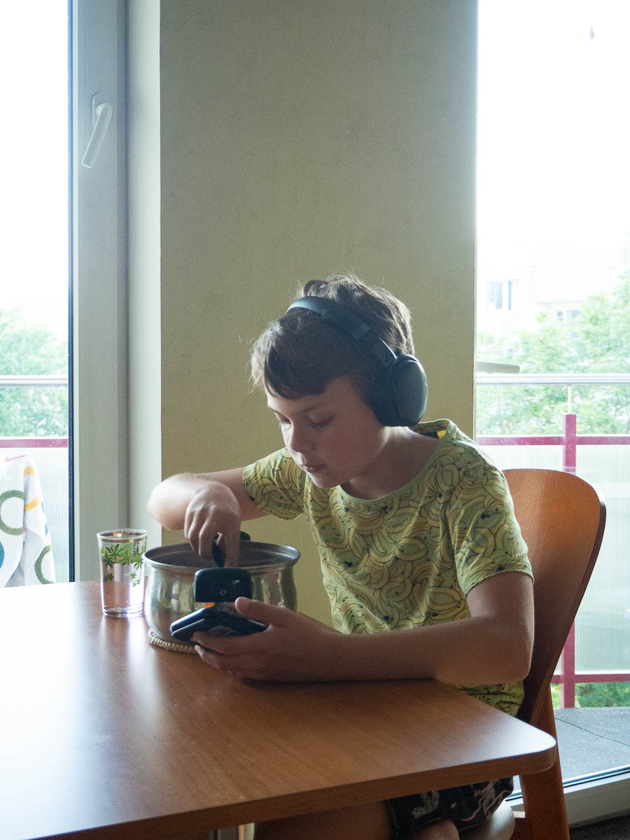 This photo is from our stay in Estonia. Adrian is eating reheated one-pot pasta straight from the pot.
