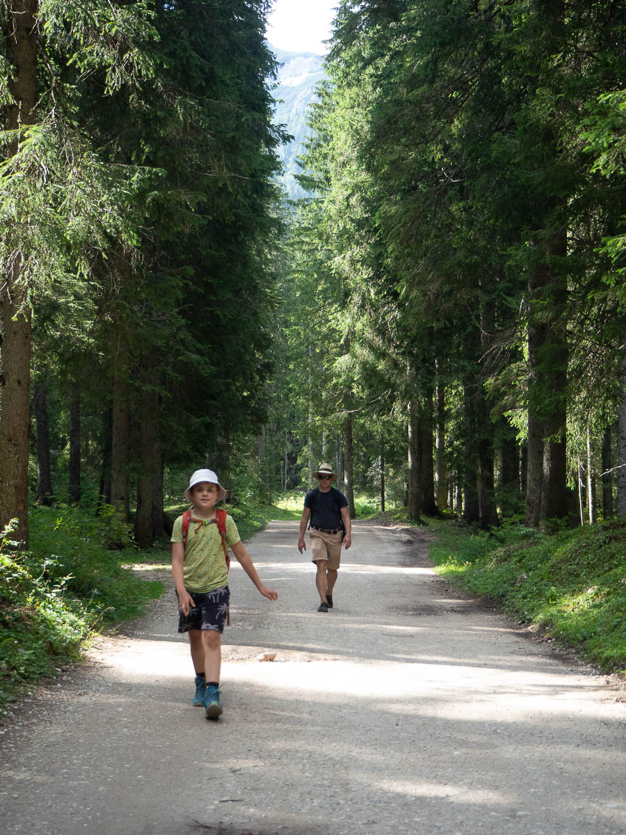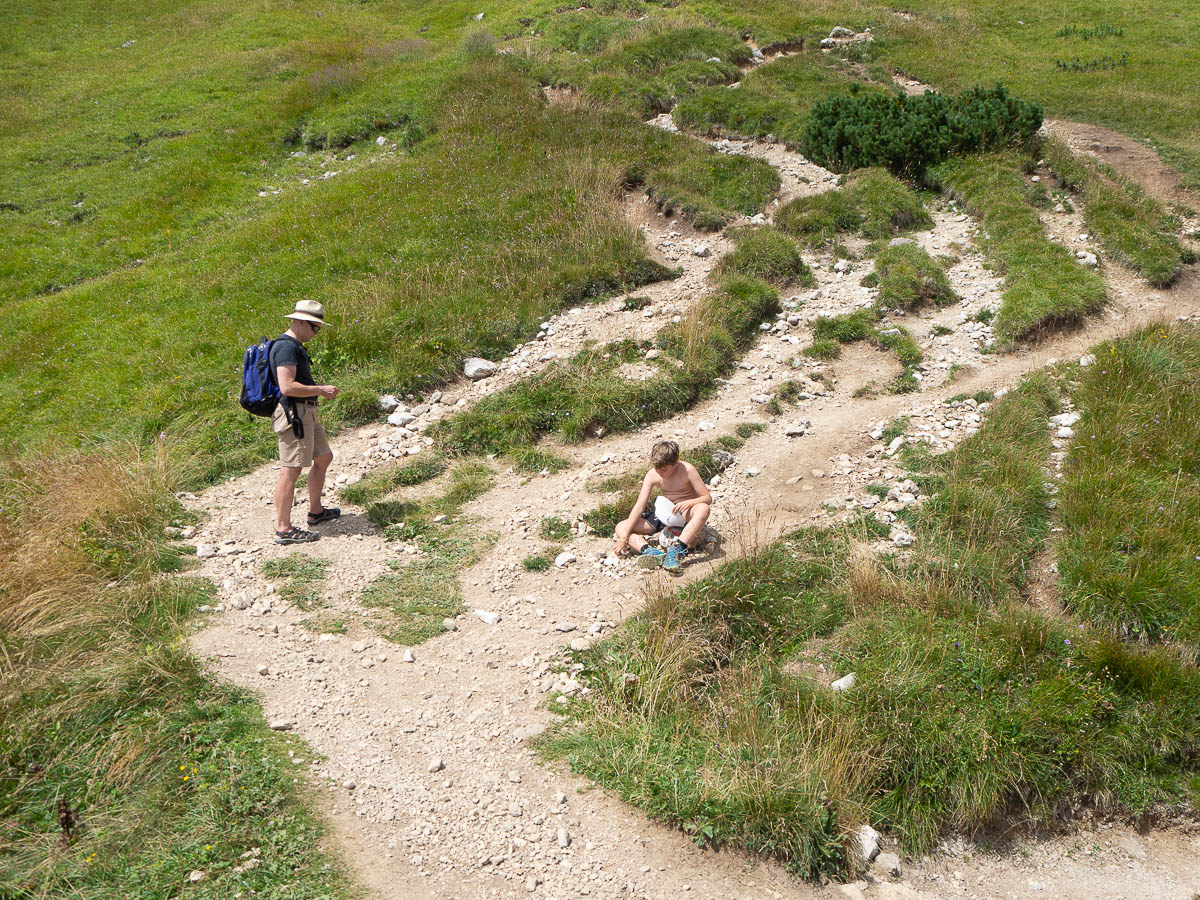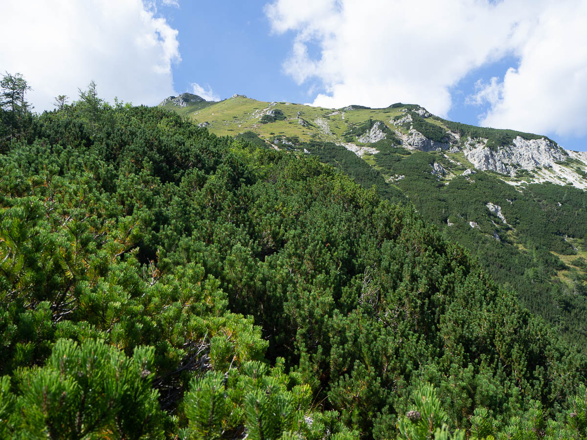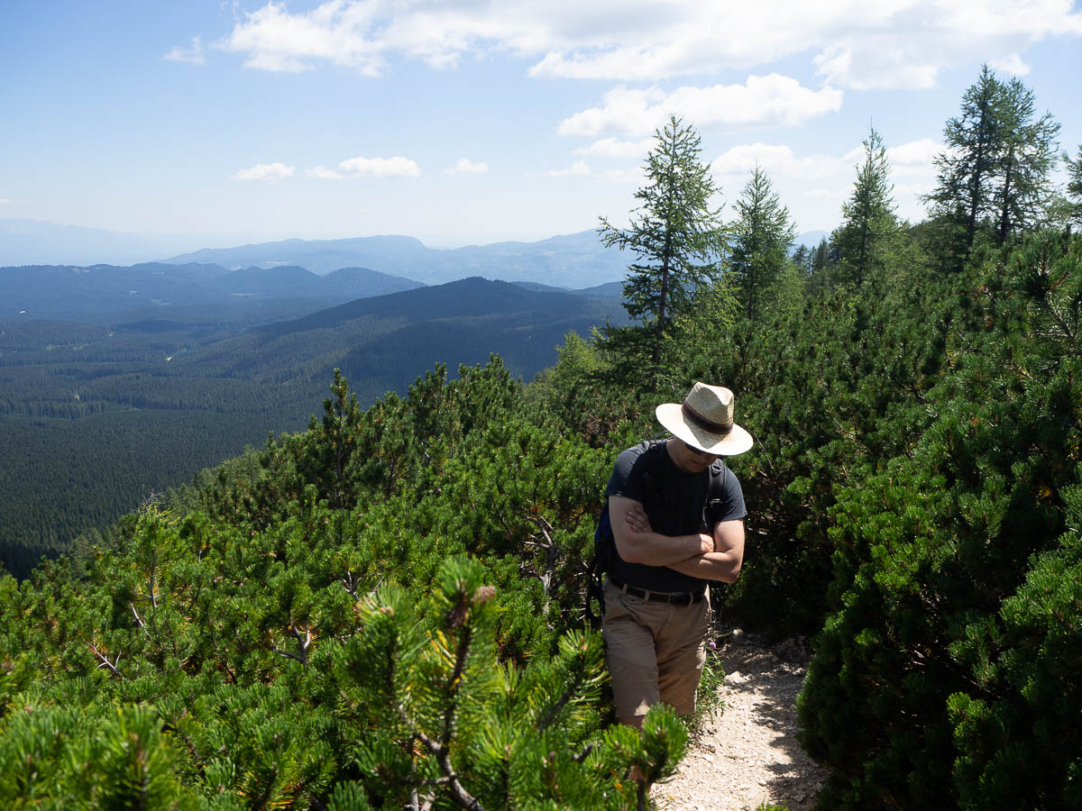 The actual ascent was just over 700 metres. Which is still a lot, especially on a hot, sunny day! And the route up this mountain was steep and unrelenting. Up, up, up, constantly, with barely any breaks in the ascent, or even a zig-zag. The first half of the ascent was also quite boring – for a big chunk of the lower parts, we followed a dusty trail through through a monotonous spruce forest. I don’t even have any photos from that part.