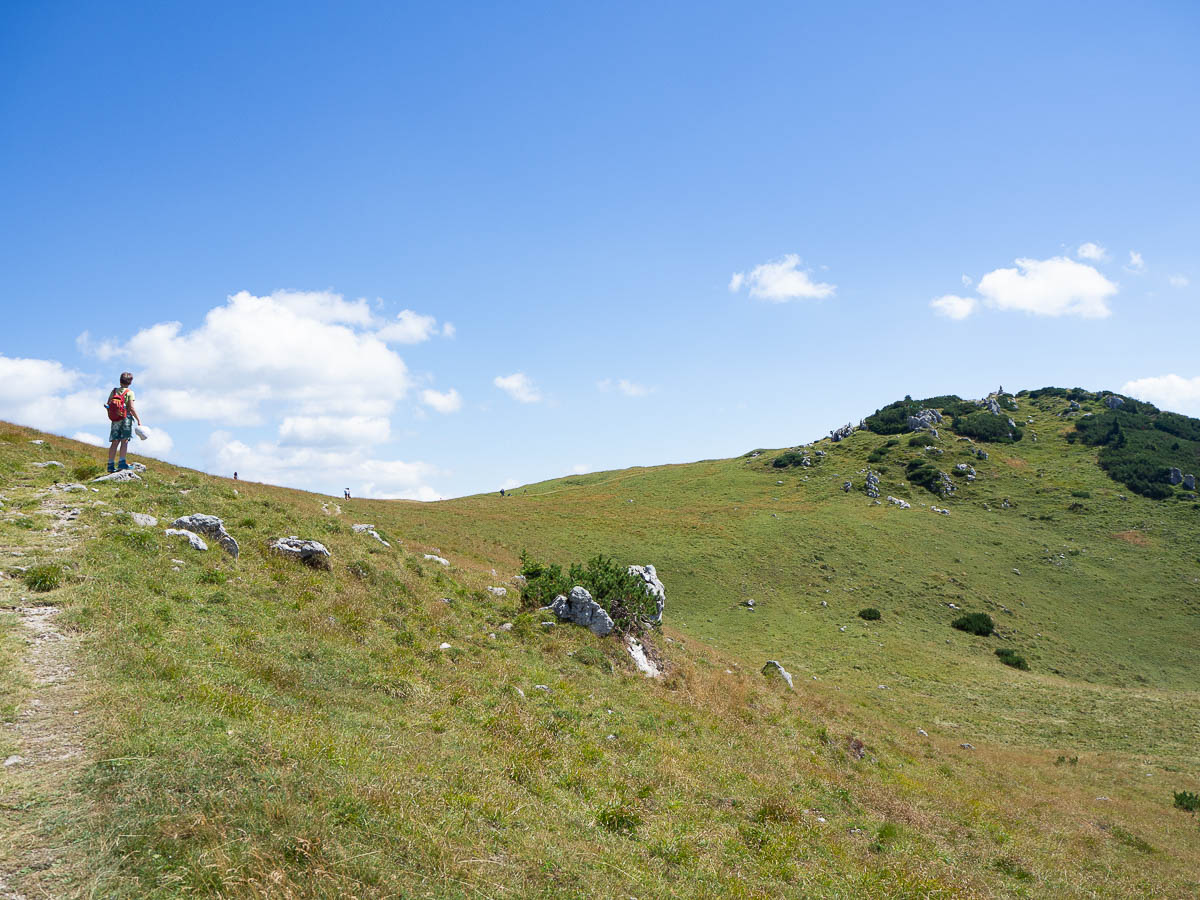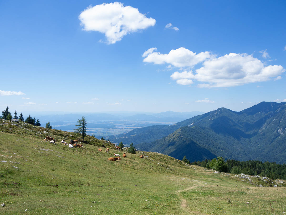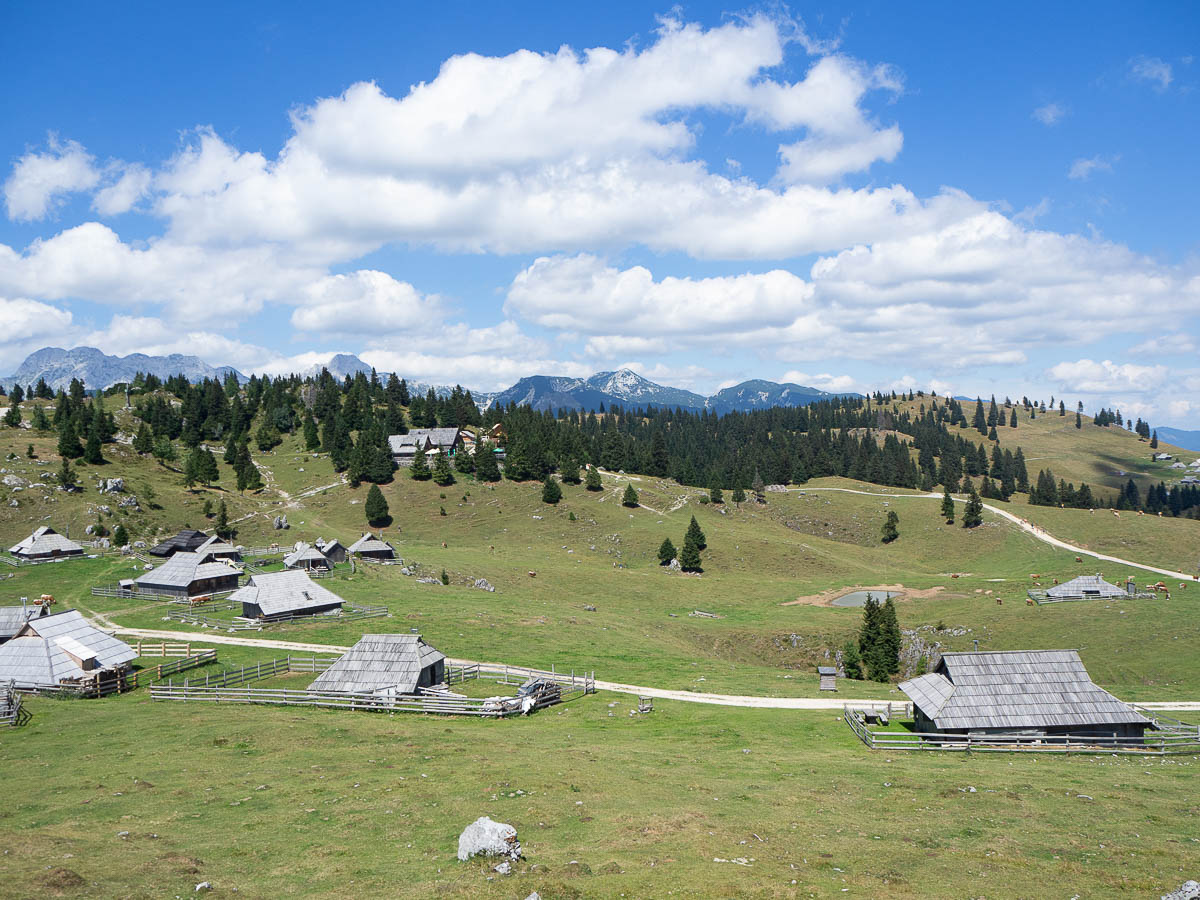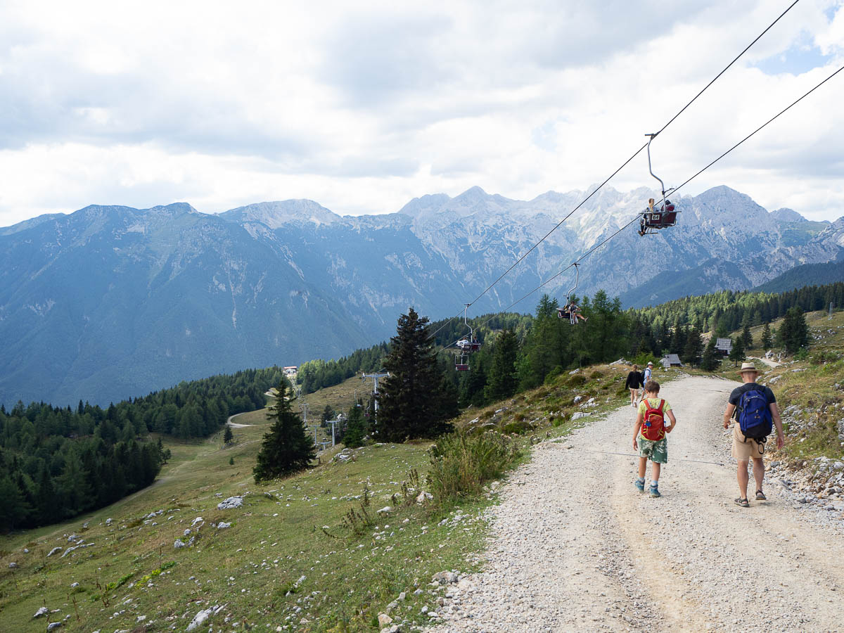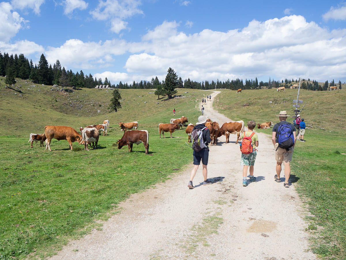 No river valleys today! We went hiking on Velika Planina, a mountain plateau covered mostly in pastureland and cows. A complete change in scenery. And we didn’t even have to climb the hill to get up there – a cable car did the work for us. At 50 EUR for a family, the cable car ticket price seemed rather steep, and I was actually considering finding an alternative hike for today. 50 EUR just to be allowed to walk! But I’m glad we went with this option after all, because the scenery up there was quite unique.