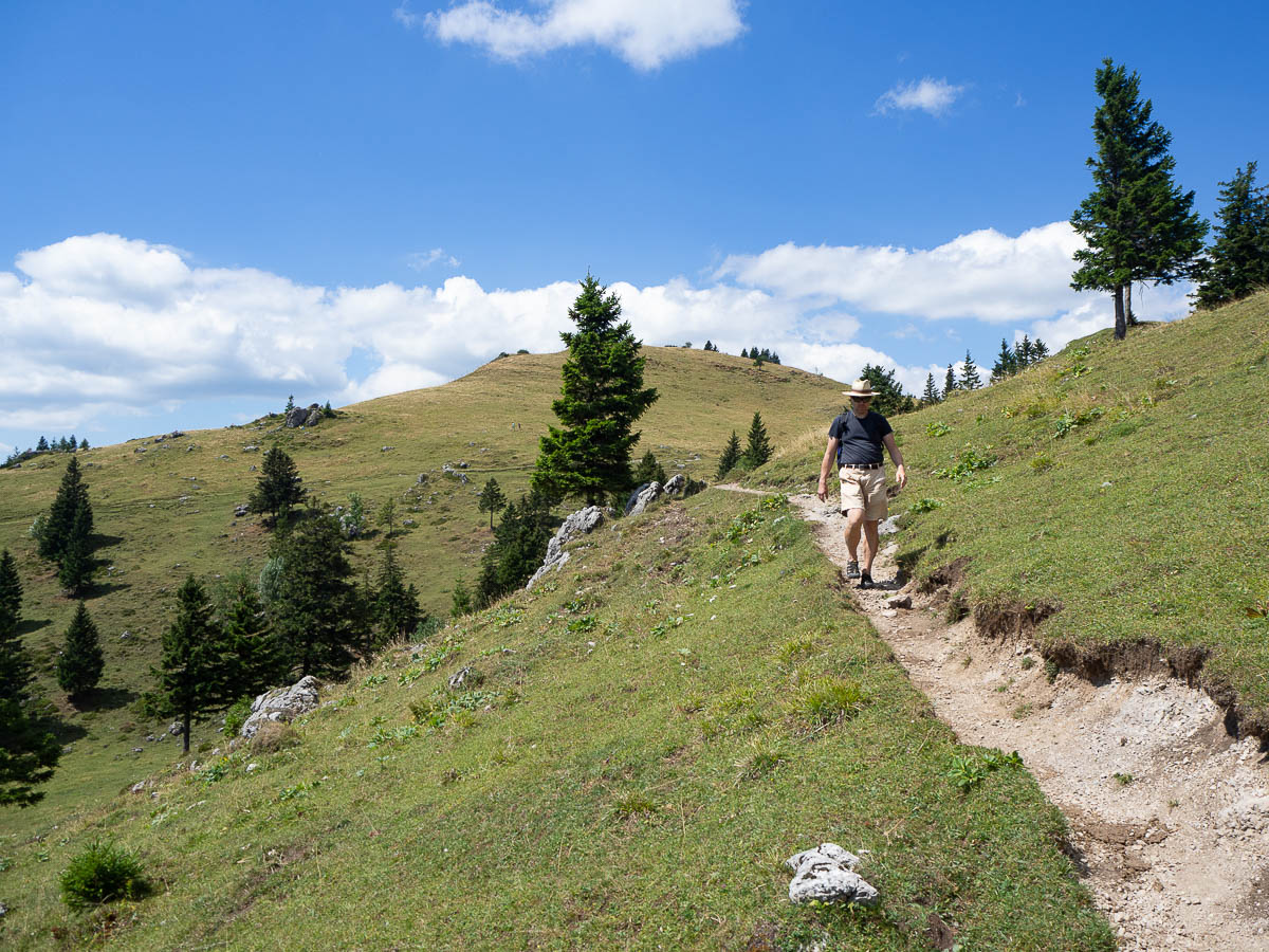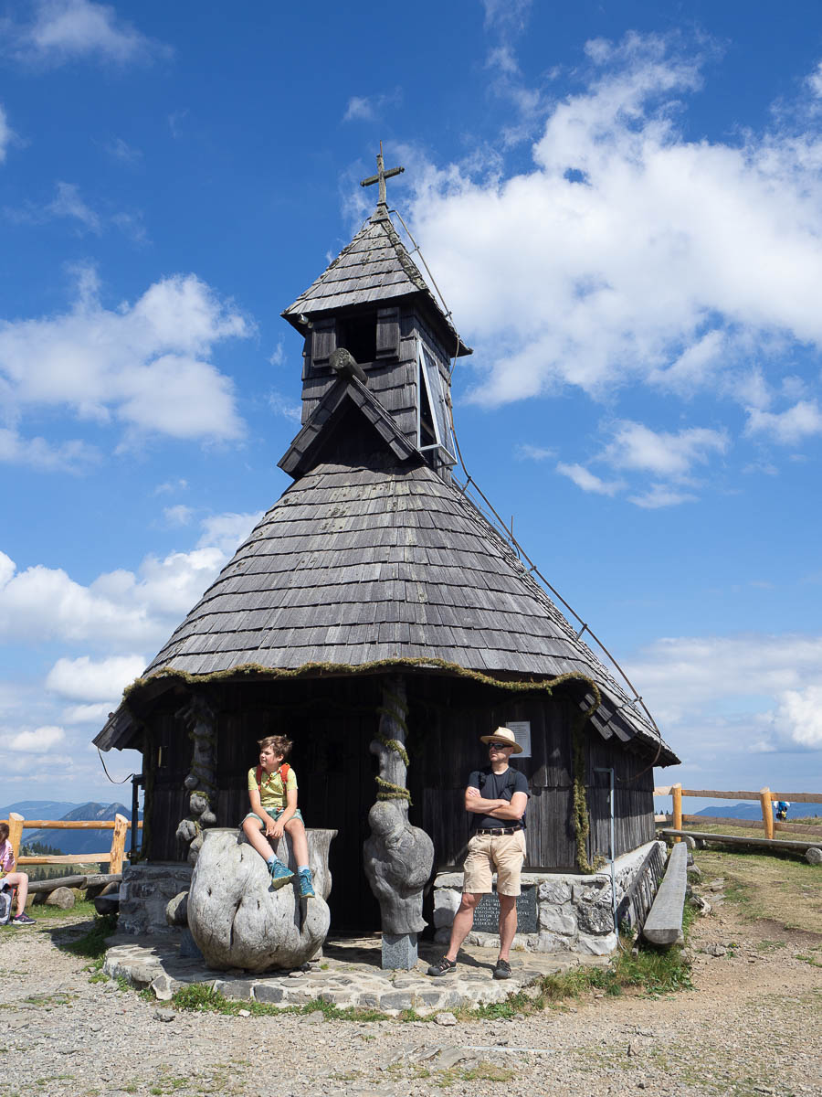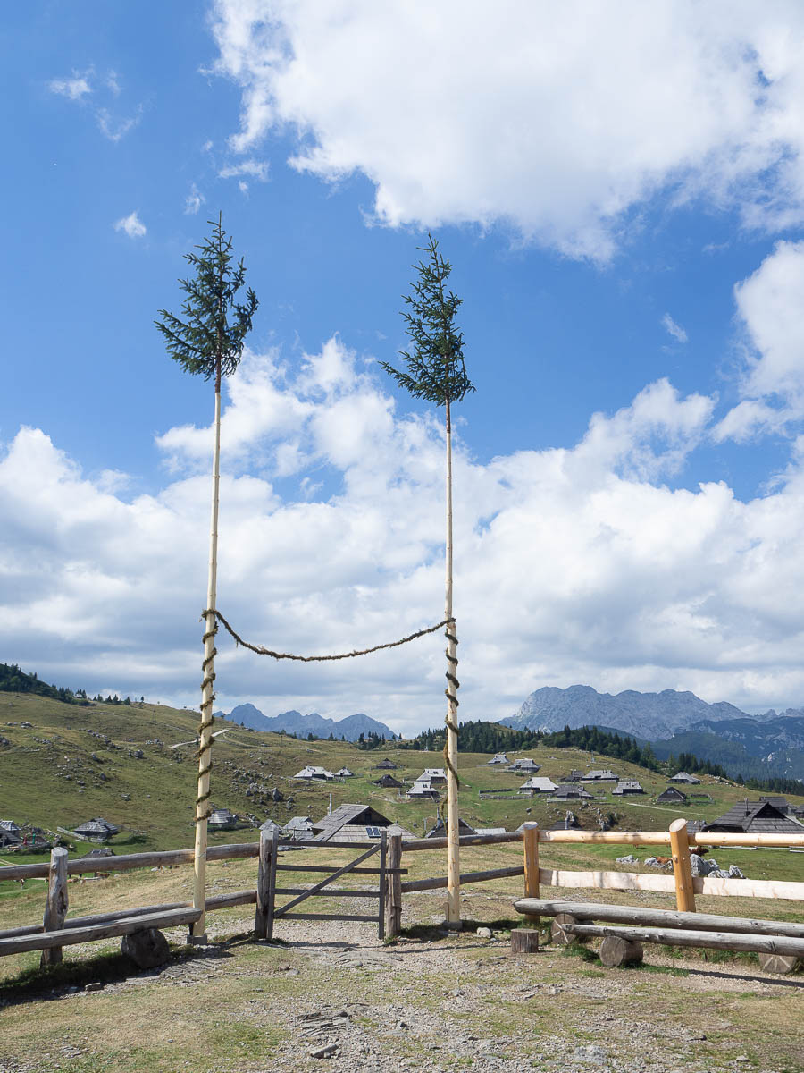 Back to the plateau and its huts! One of the buildings was a beautiful wooden chapel. The gateway of the chapel was decorated with two spruce trees, stripped of bark and branches all the way except for the very top. Eric had noticed a similar tree while driving, so it’s not just some tourist thing here on Velika Planina. I asked around, and a Slovenian colleague tells me they’re called mlaj and put up for celebrations – traditionally for May Day (like a version of the maypole I guess) but more recently also for birthdays and weddings.