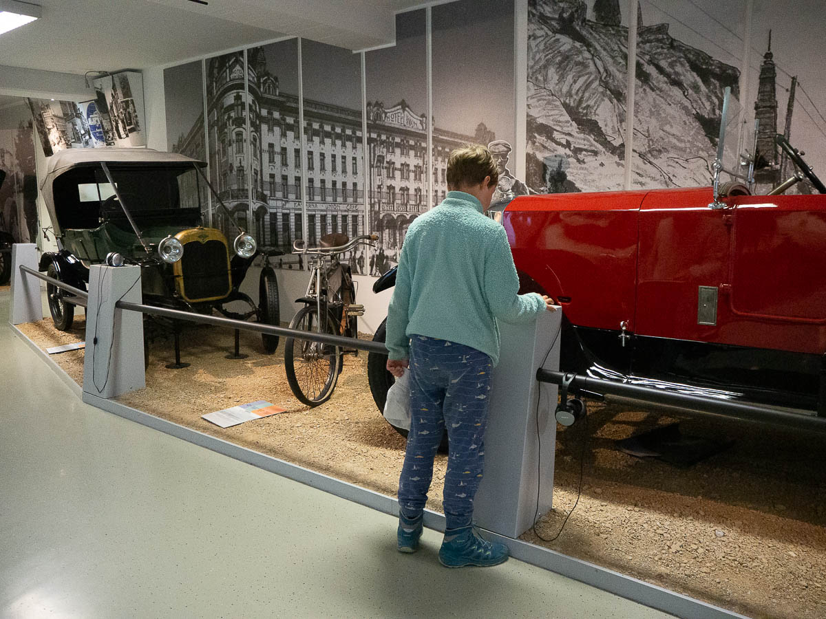 Our time here was limited so we didn’t have time for more than some cursory browsing and the occasional deep dive into a random area. We enjoyed an exhibition about the history of cars and other means of motorized personal transportation. I naturally spent a fair bit of time in the exhibition about the textile industry. There was also a surprisingly interesting and well-presented one about the history of forestry, where we learned about different methods for “first mile” timber transportation, including rafting, sledding, wooden timber chutes, and simply shoving the timber down the side of the mountain.